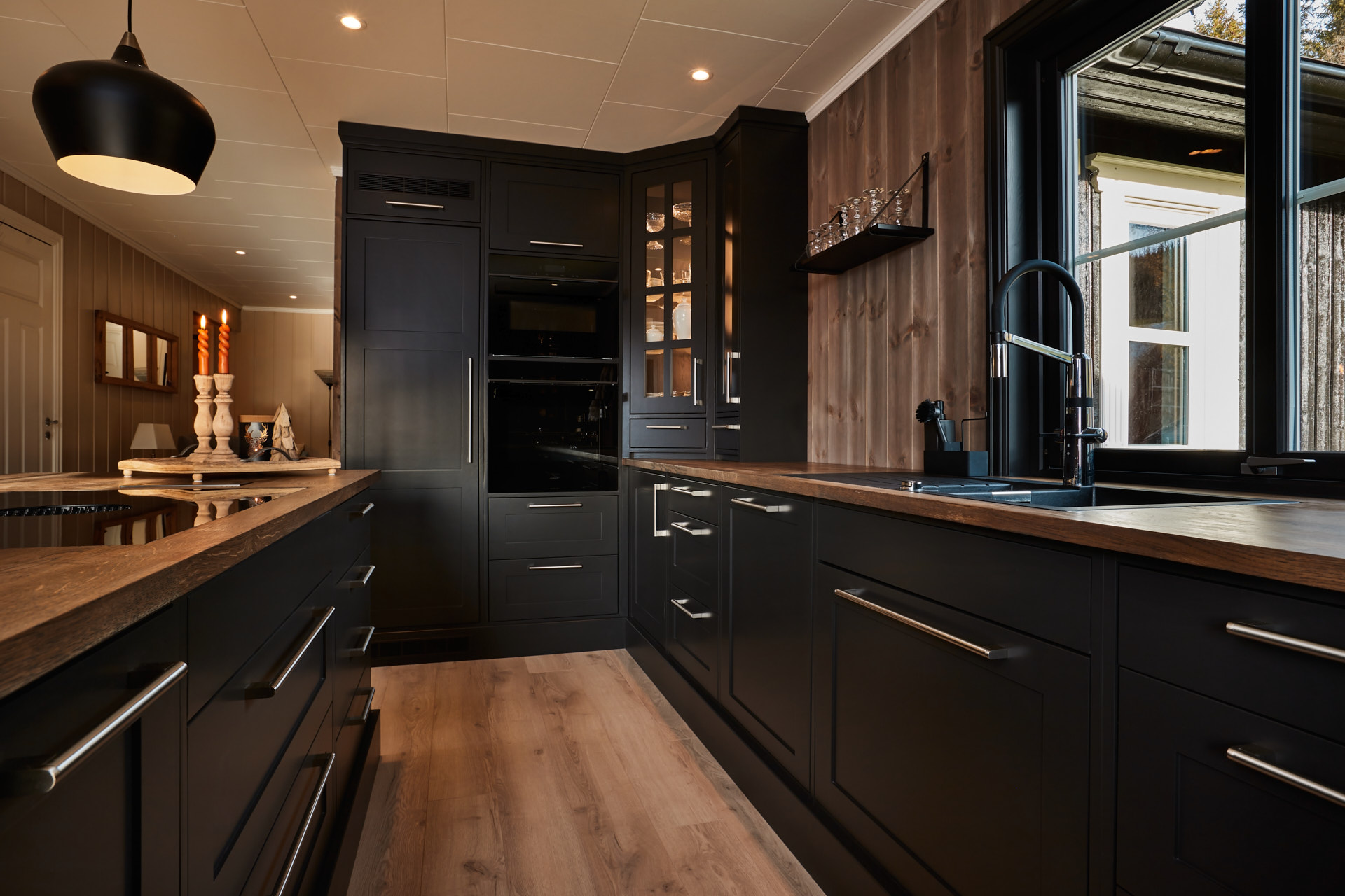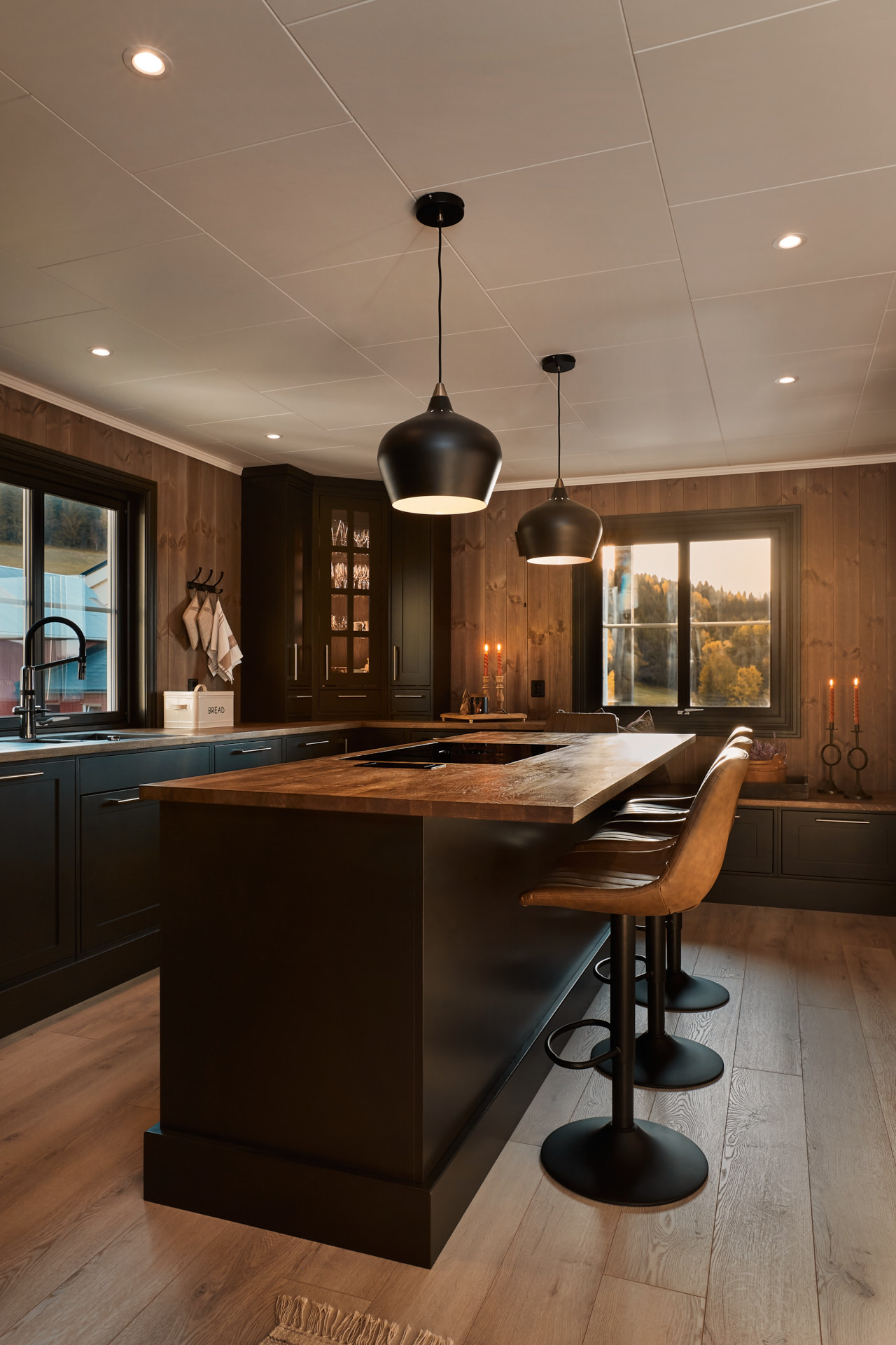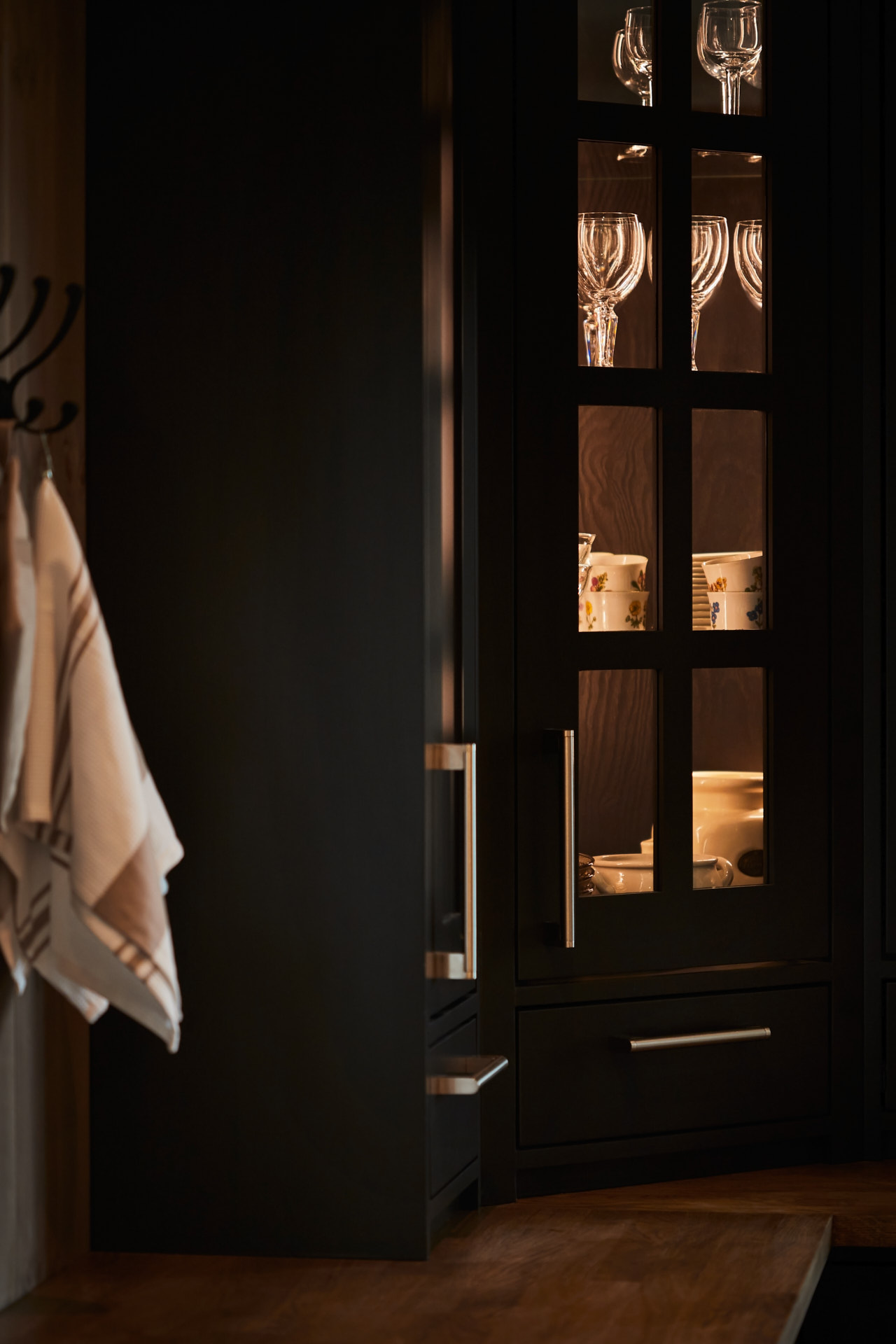 Vitrineskapene er plassert i hvert sitt hjørne av kjøkkenet, utstyrt med belysning innvendig fra hver side og fra bunn til topp i skapet - noe som lyser lunt og fint opp i et kjøkken malt i fargen dempet sort, med benkeplater av eik.