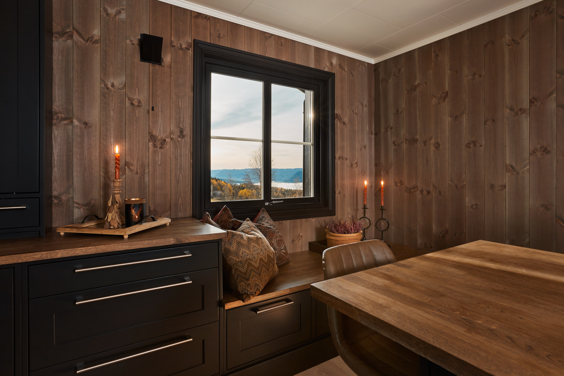 Med både kjøkkenøy, vitrineskap og sittebenk, er dette et kjøkken som rommer mye, både funksjoner og atmosfære. Rommet er avlangt og ga oss muligheten til å bygge en lang kjøkkenøy, med sitteplasser til 4 personer.