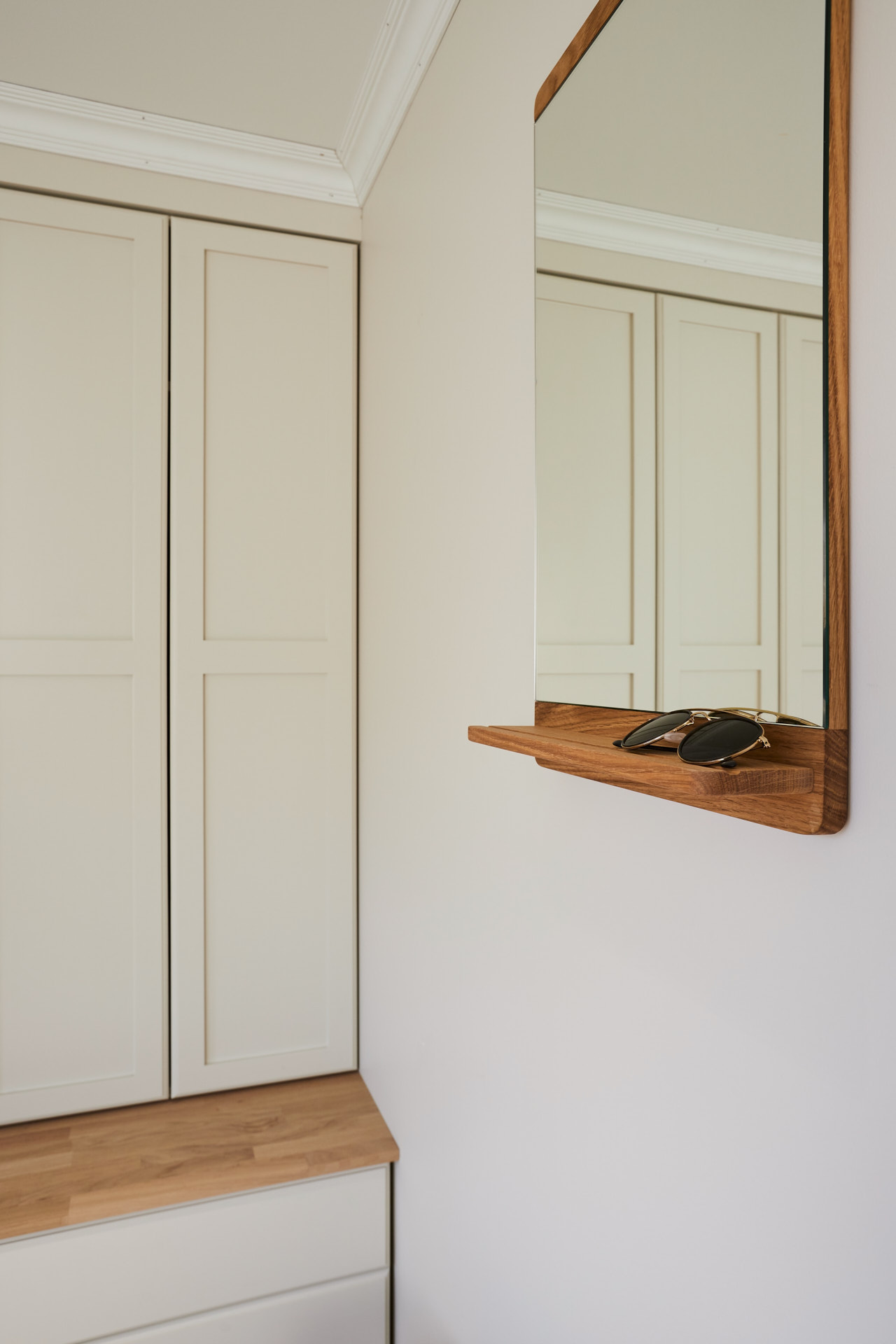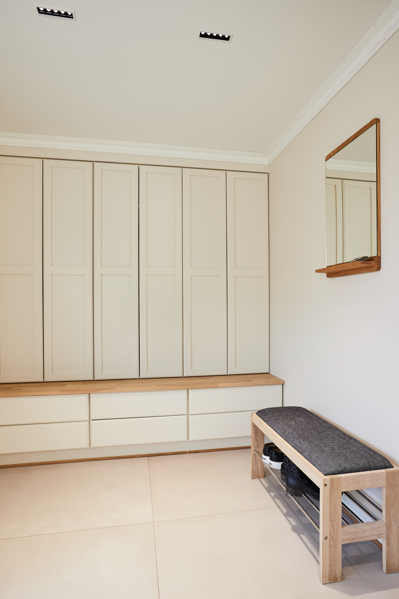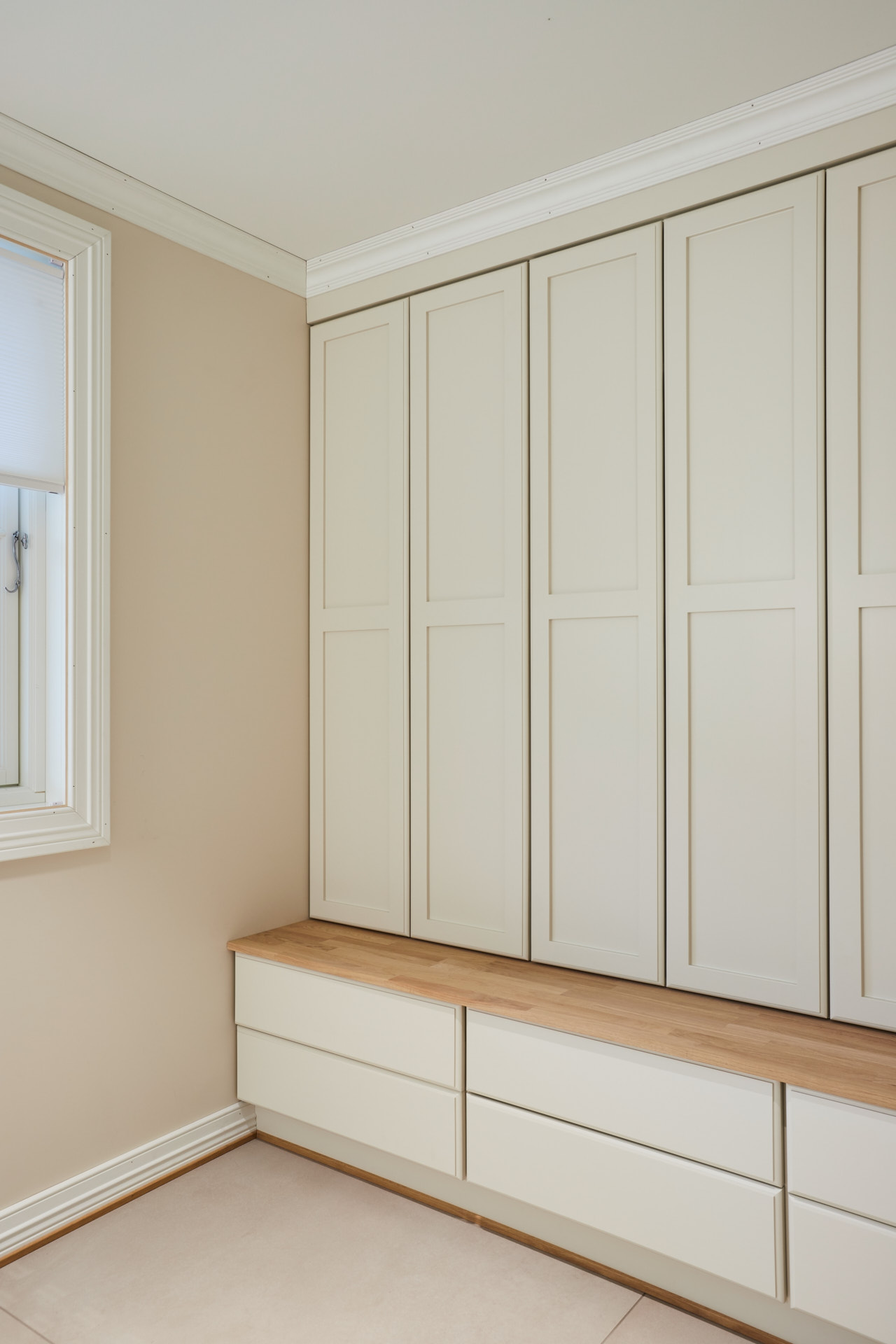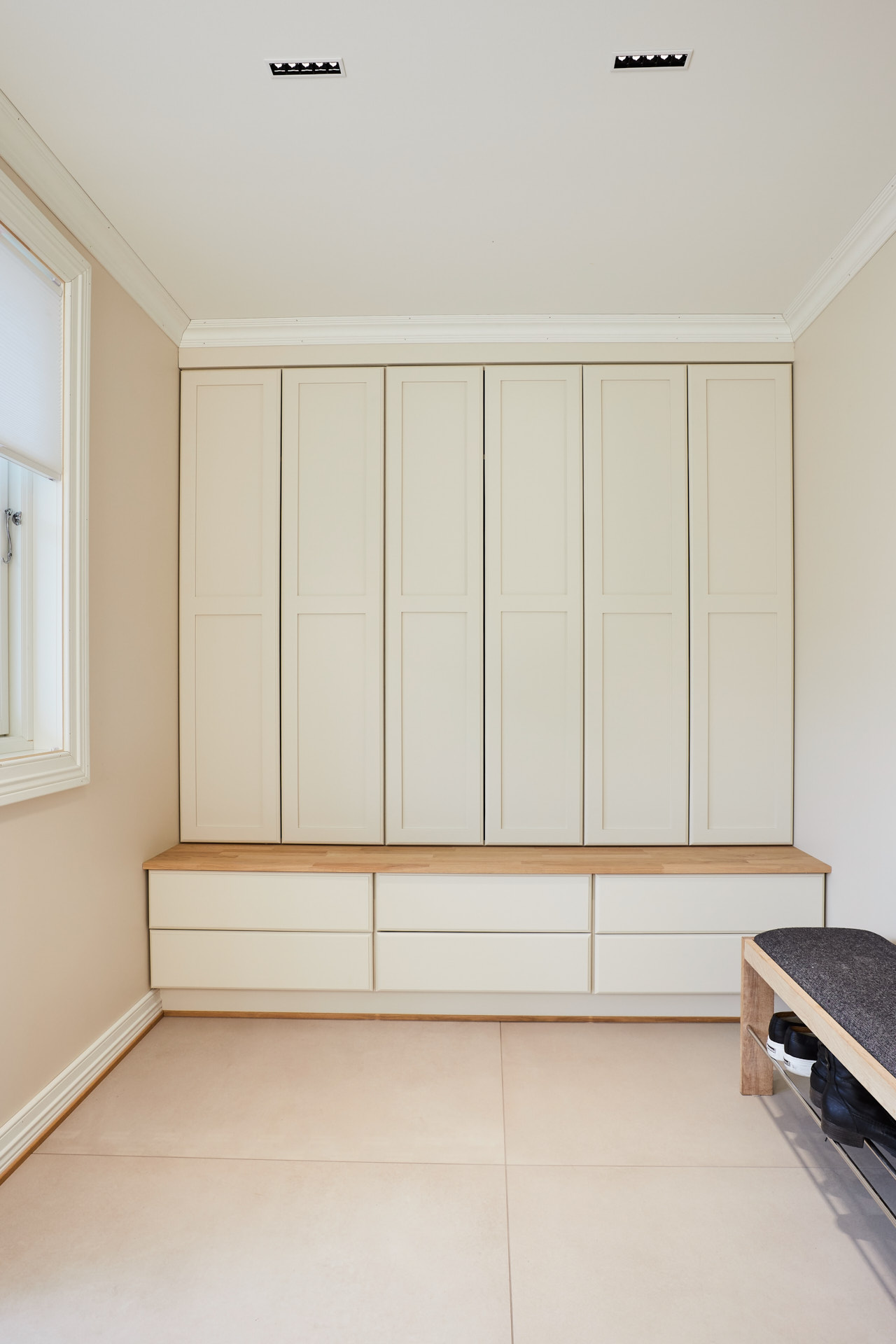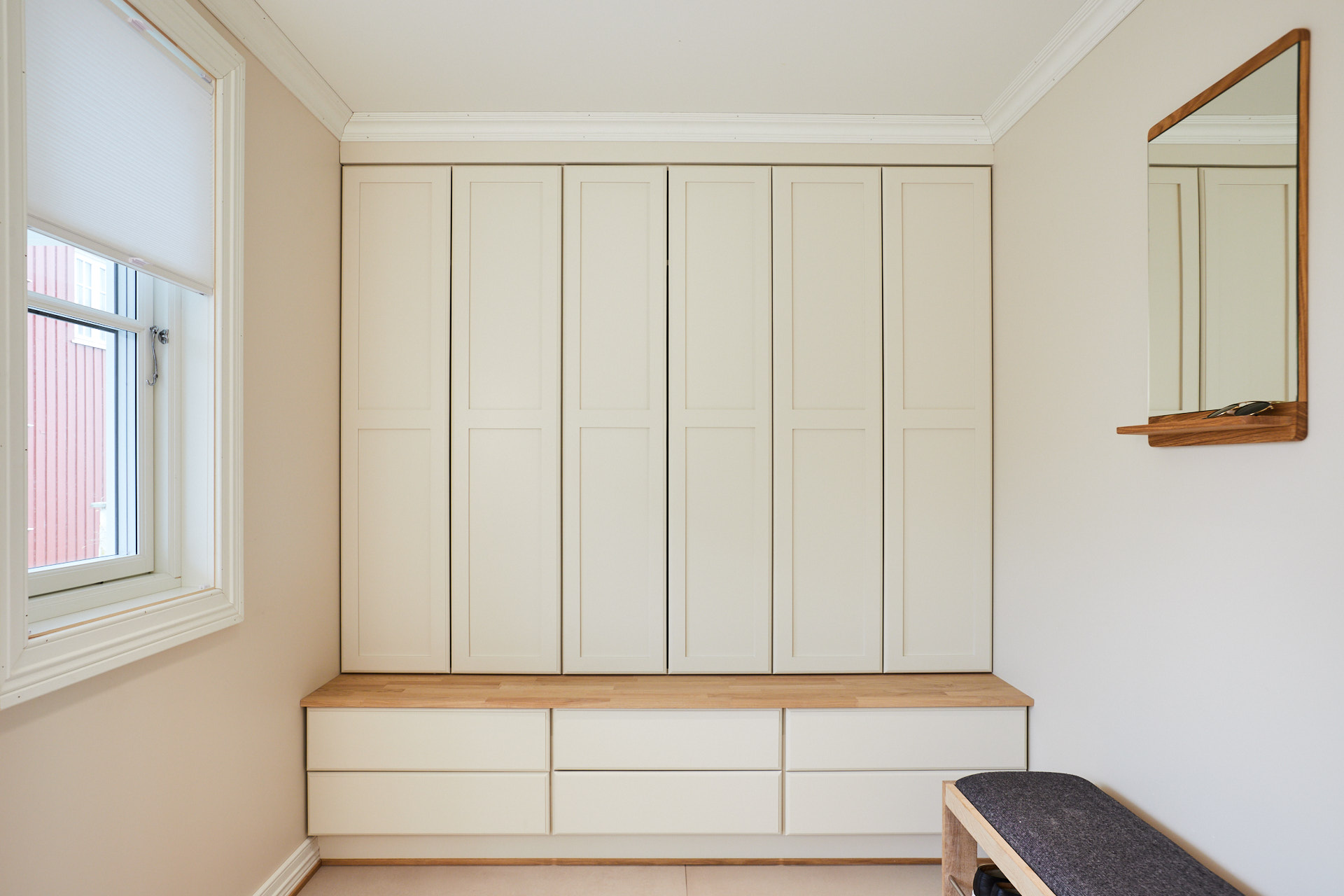 Garderobeskap som sklir godt i ett med resten av rommet. God lagringsplass med høyskap til taket og praktisk sittebenk med skuffer under. Skrog av kvistfri furu. Skapdører og skuffefronter av valchromat malt i fargen vanilje. Benkeplate av eik.