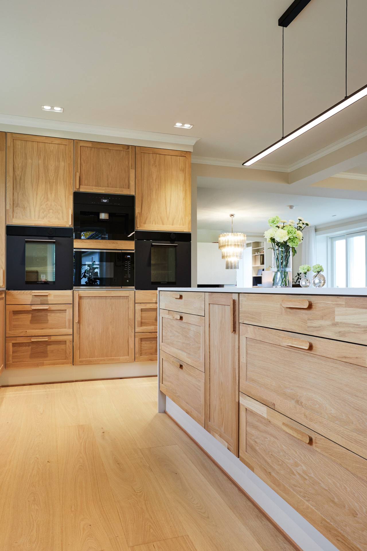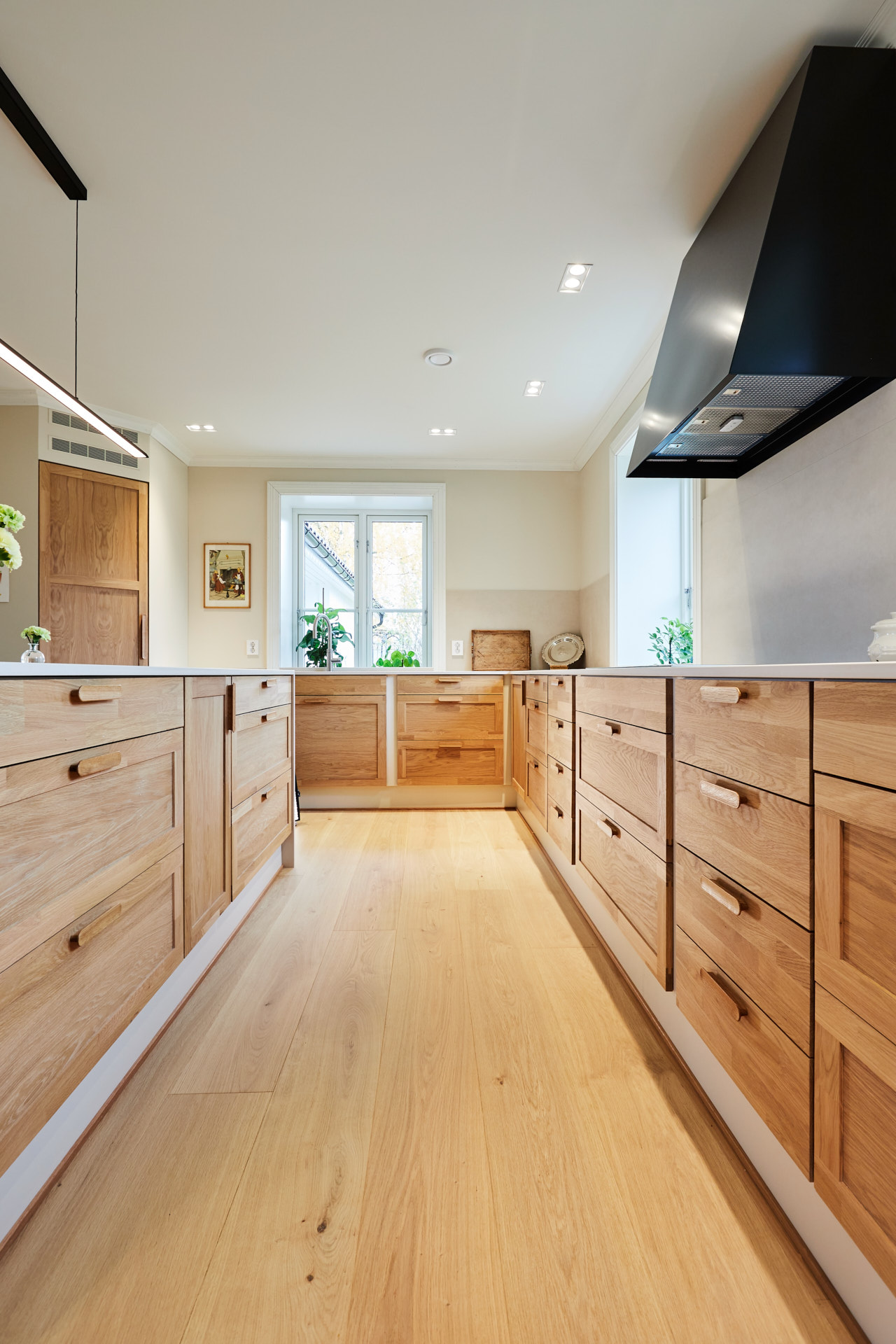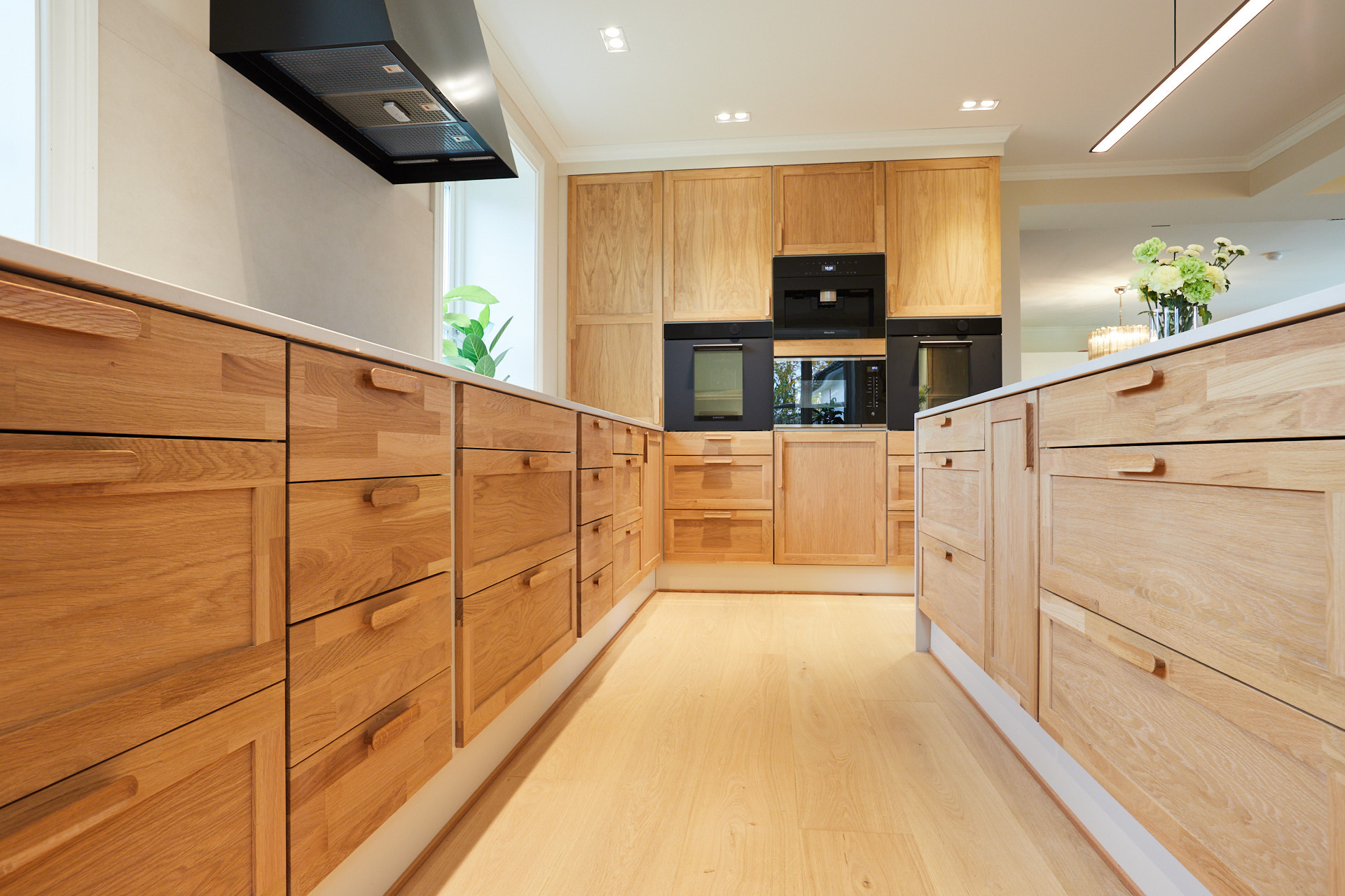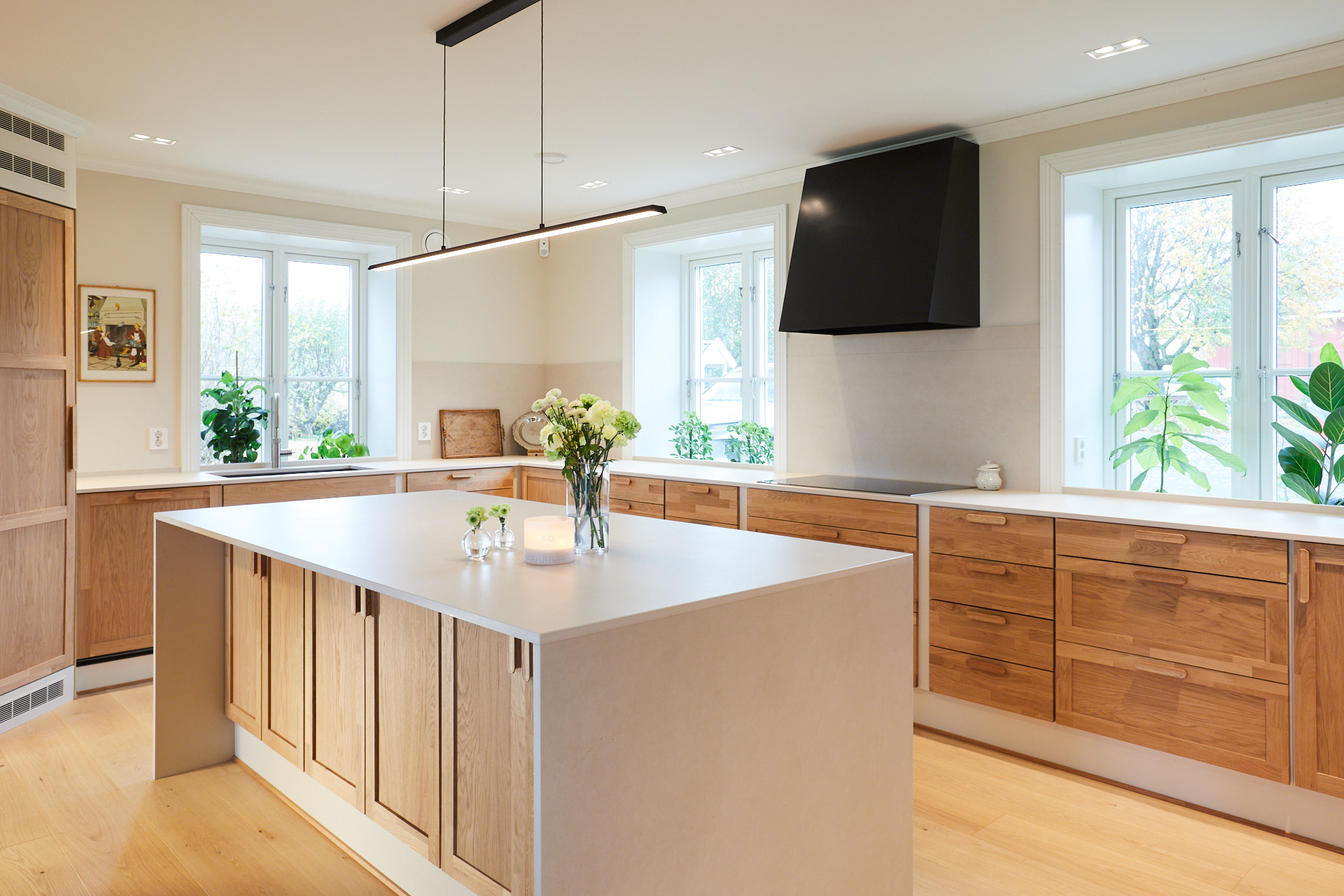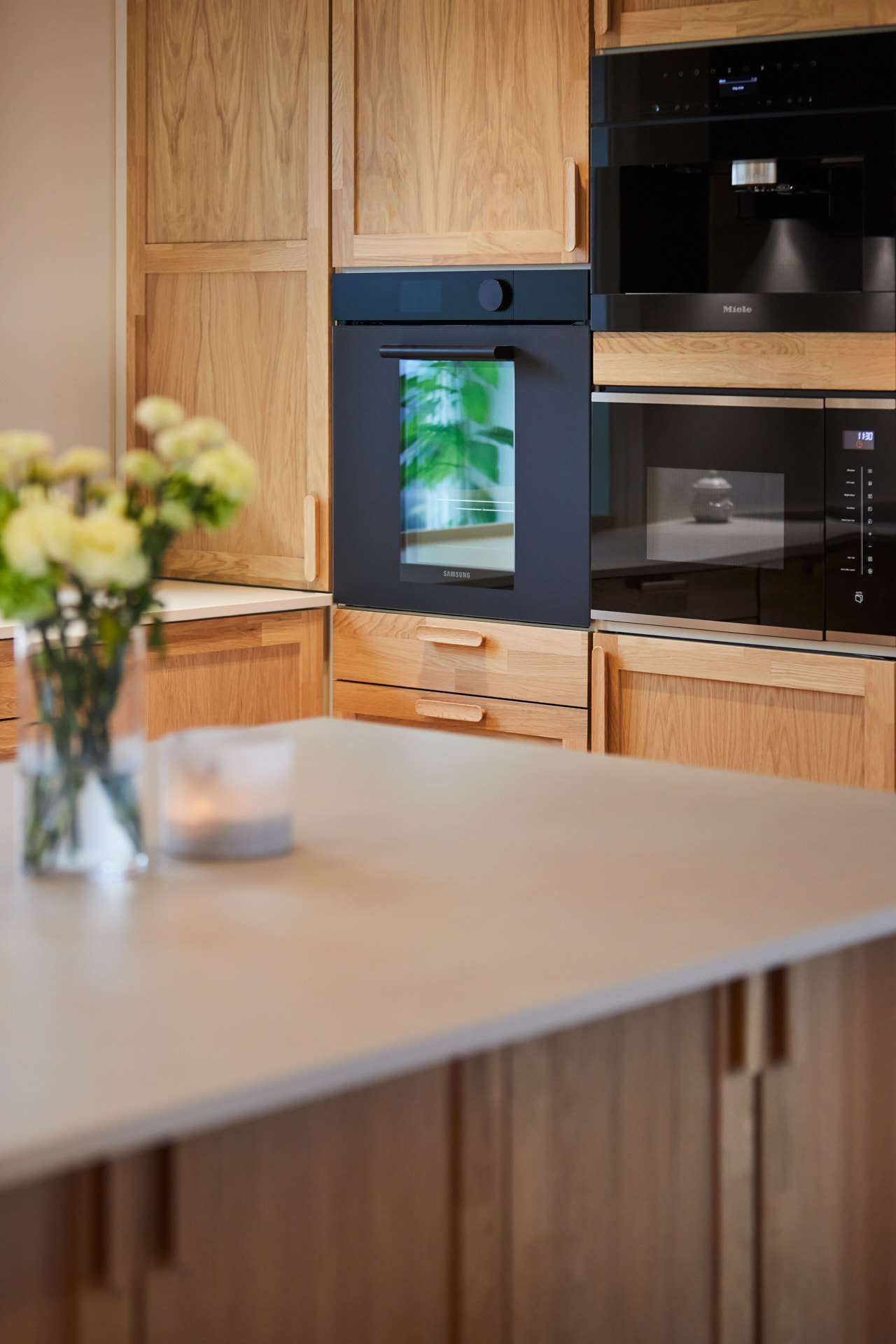 Lyst kjøkken med kjøkkenøy, der alle skuffefronter og dører er av eik som er behandlet med Osmo dekorvoks. Skrogene er laget av kvistfri furu som er malt i fargen bomull. Dette kjøkkenet har også praktiske løsninger for å oppbevare og skjule kjøkkenapparater, samtidig som de er lett tilgjengelige.