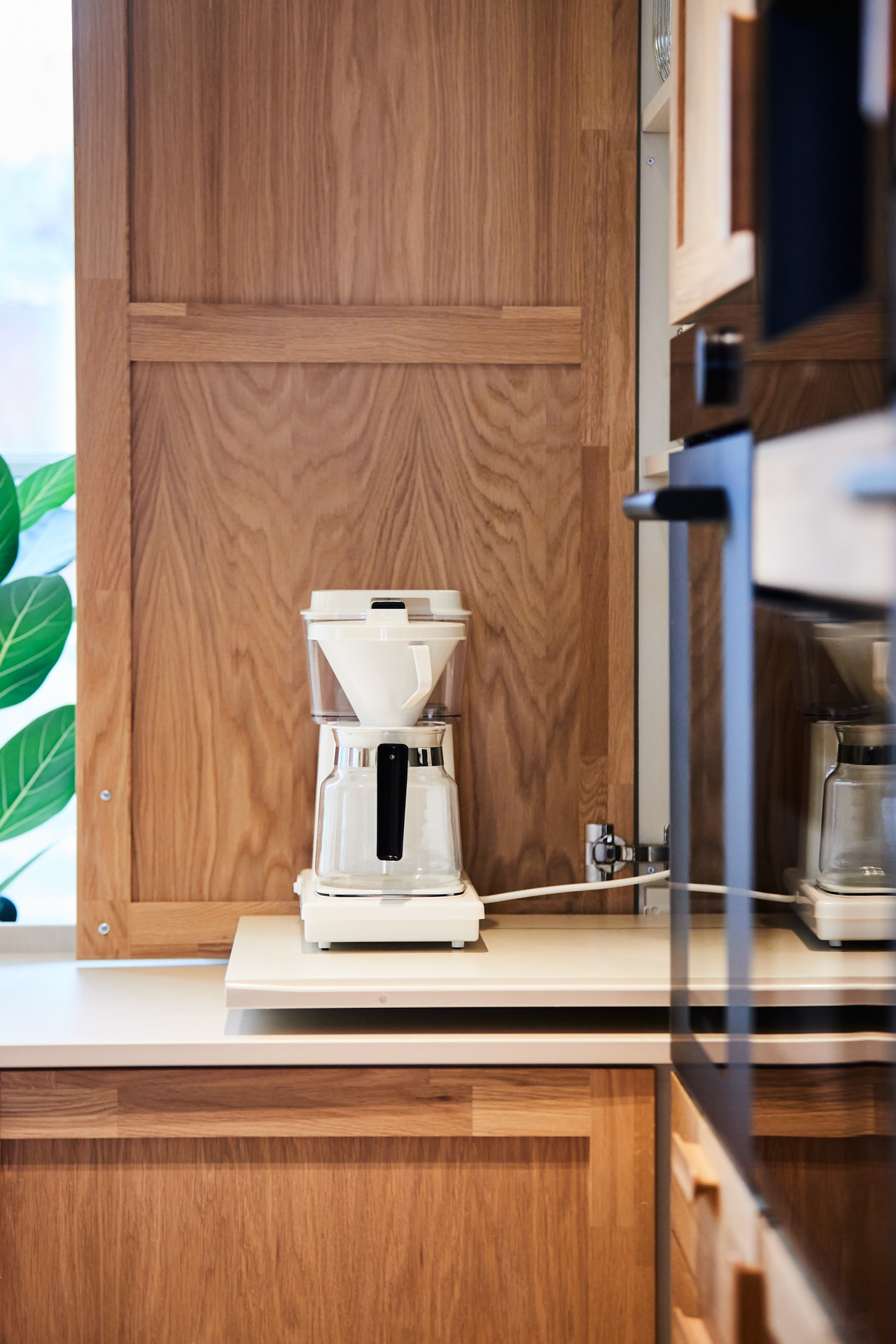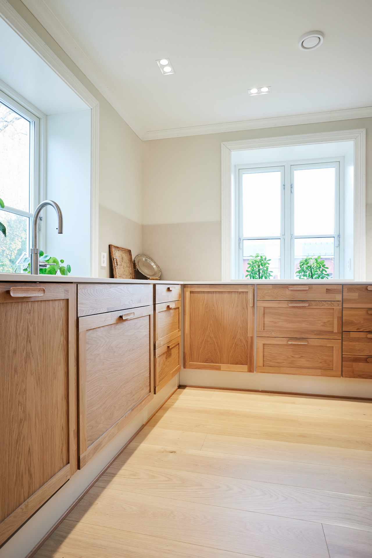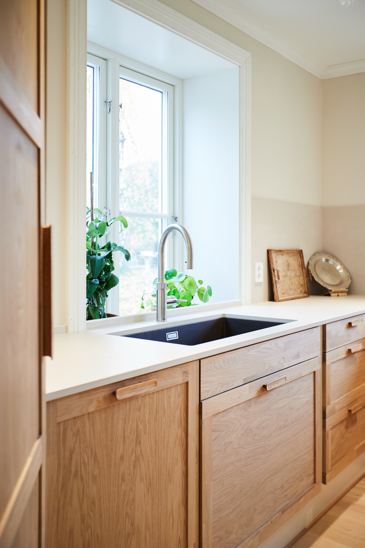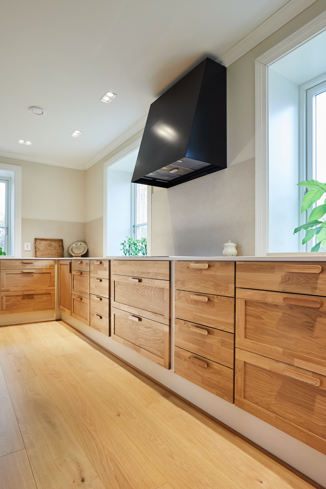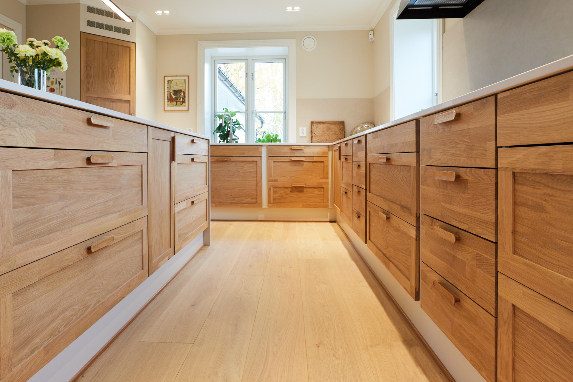 Lyst kjøkken med kjøkkenøy, der alle skuffefronter og dører er av eik som er behandlet med Osmo dekorvoks. Skrogene er laget av kvistfri furu som er malt i fargen bomull. Dette kjøkkenet har også praktiske løsninger for å oppbevare og skjule kjøkkenapparater, samtidig som de er lett tilgjengelige.