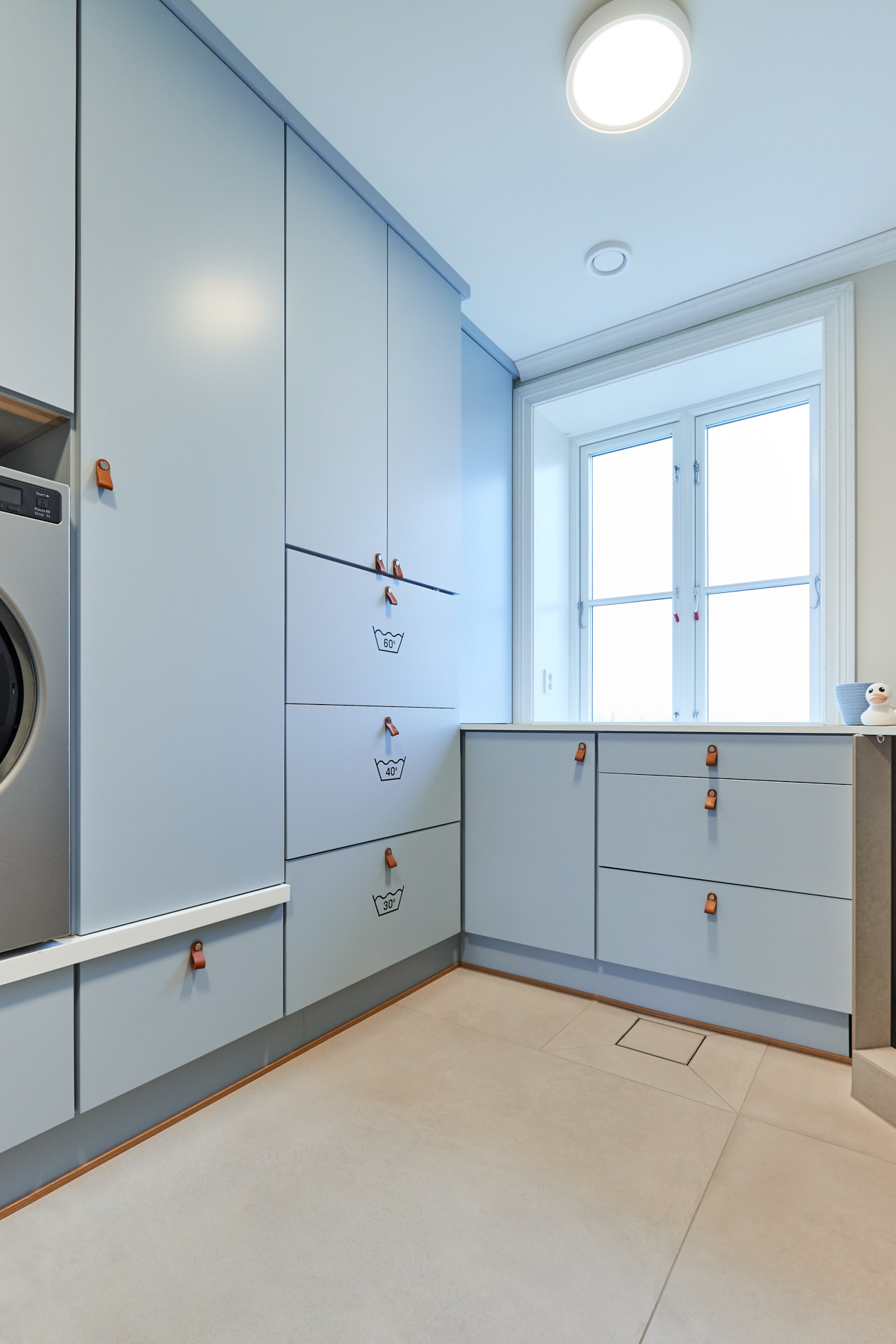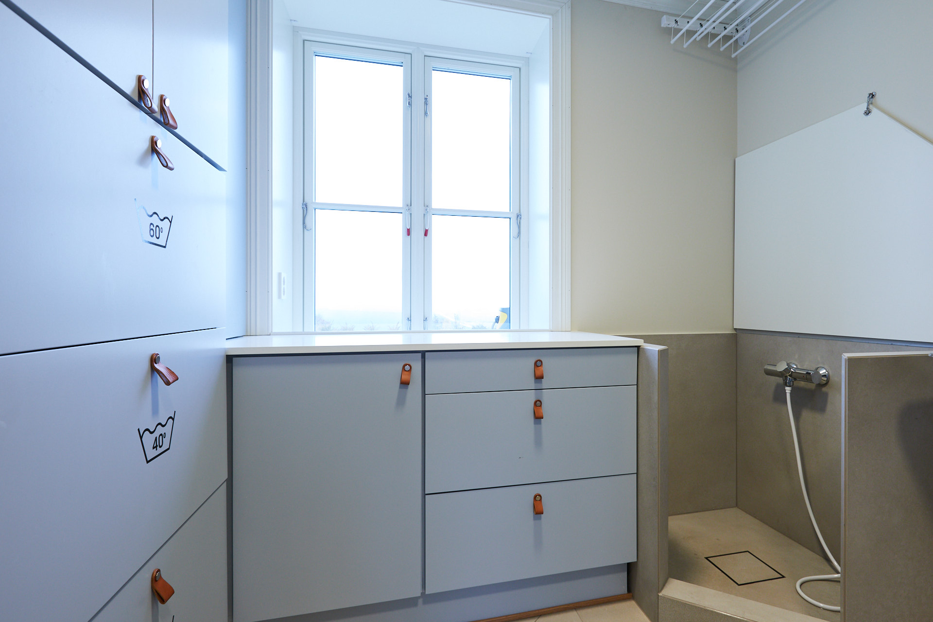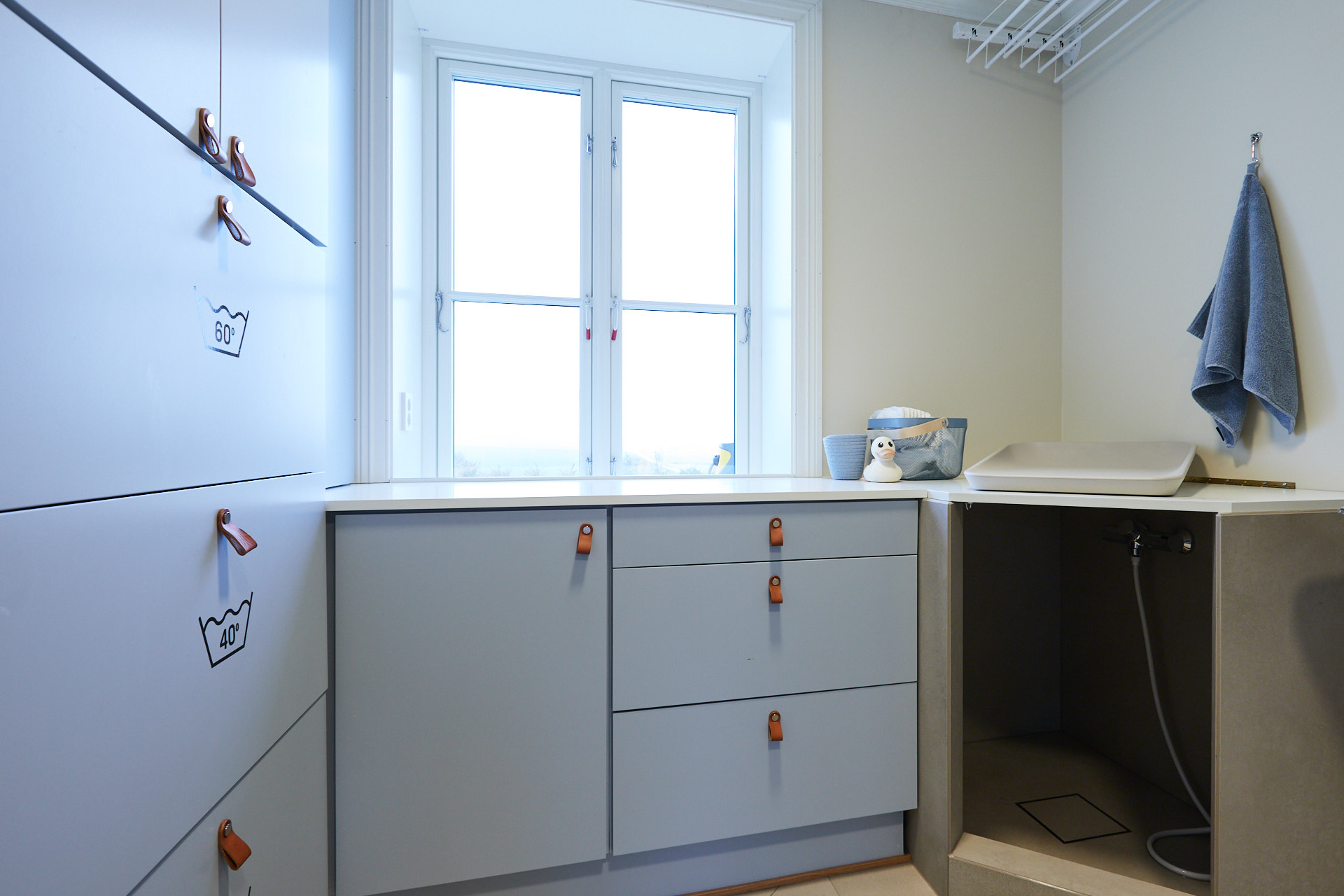 Her har vi laget innredning til kjøkken, stue, entré, vaskerom og garderobe. Lyse elegante flater er gjengangeren i dette prosjektet.