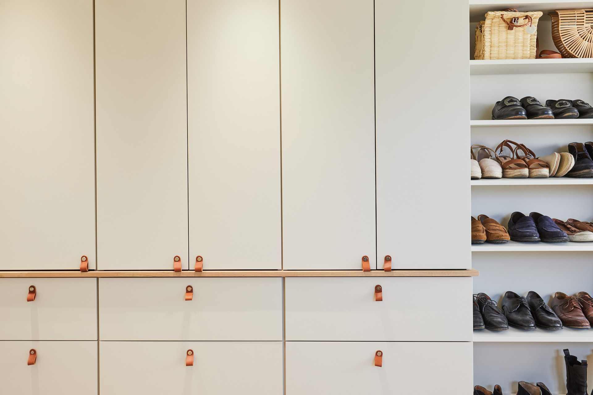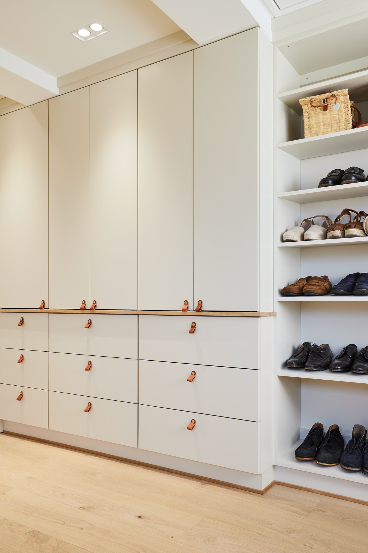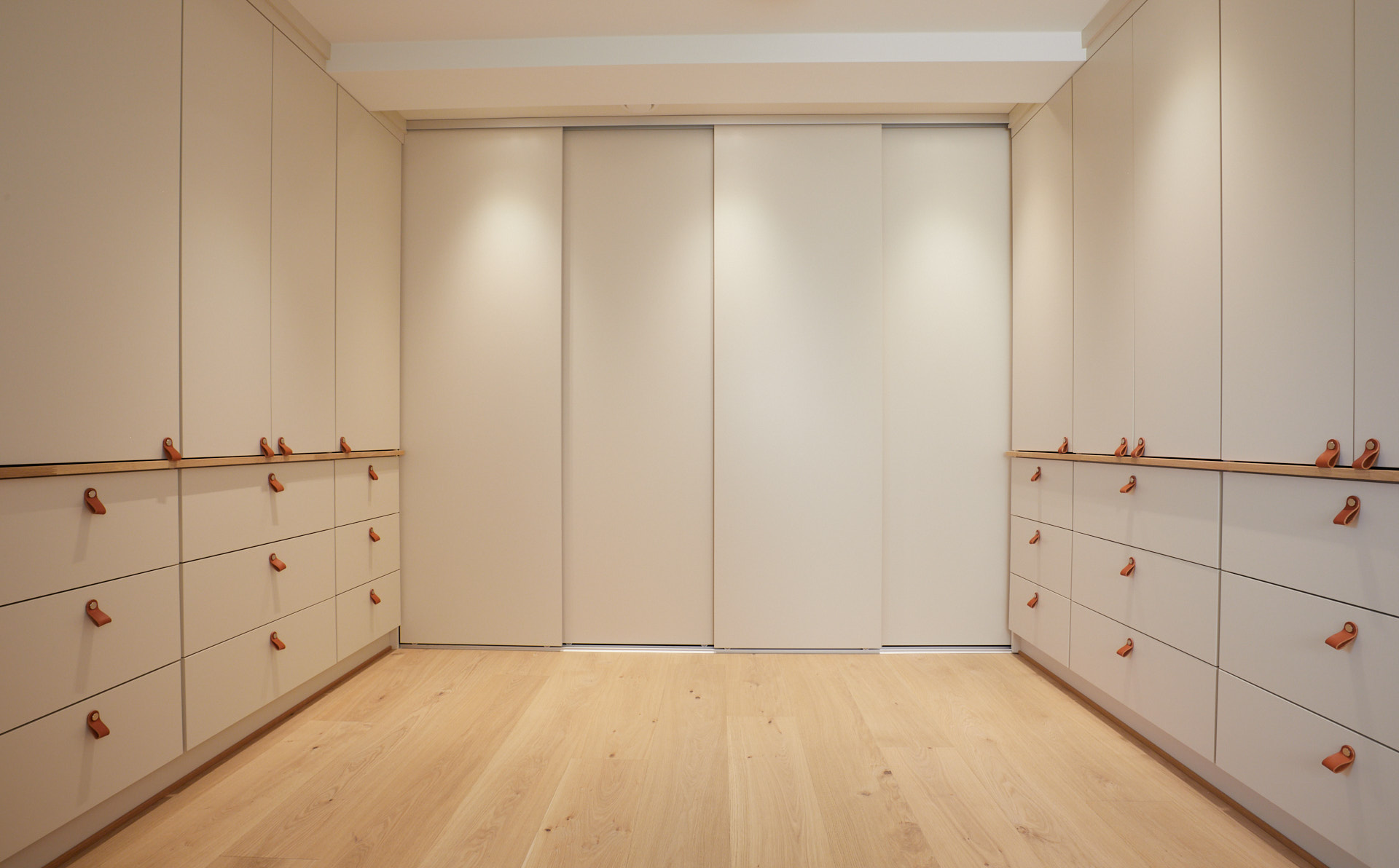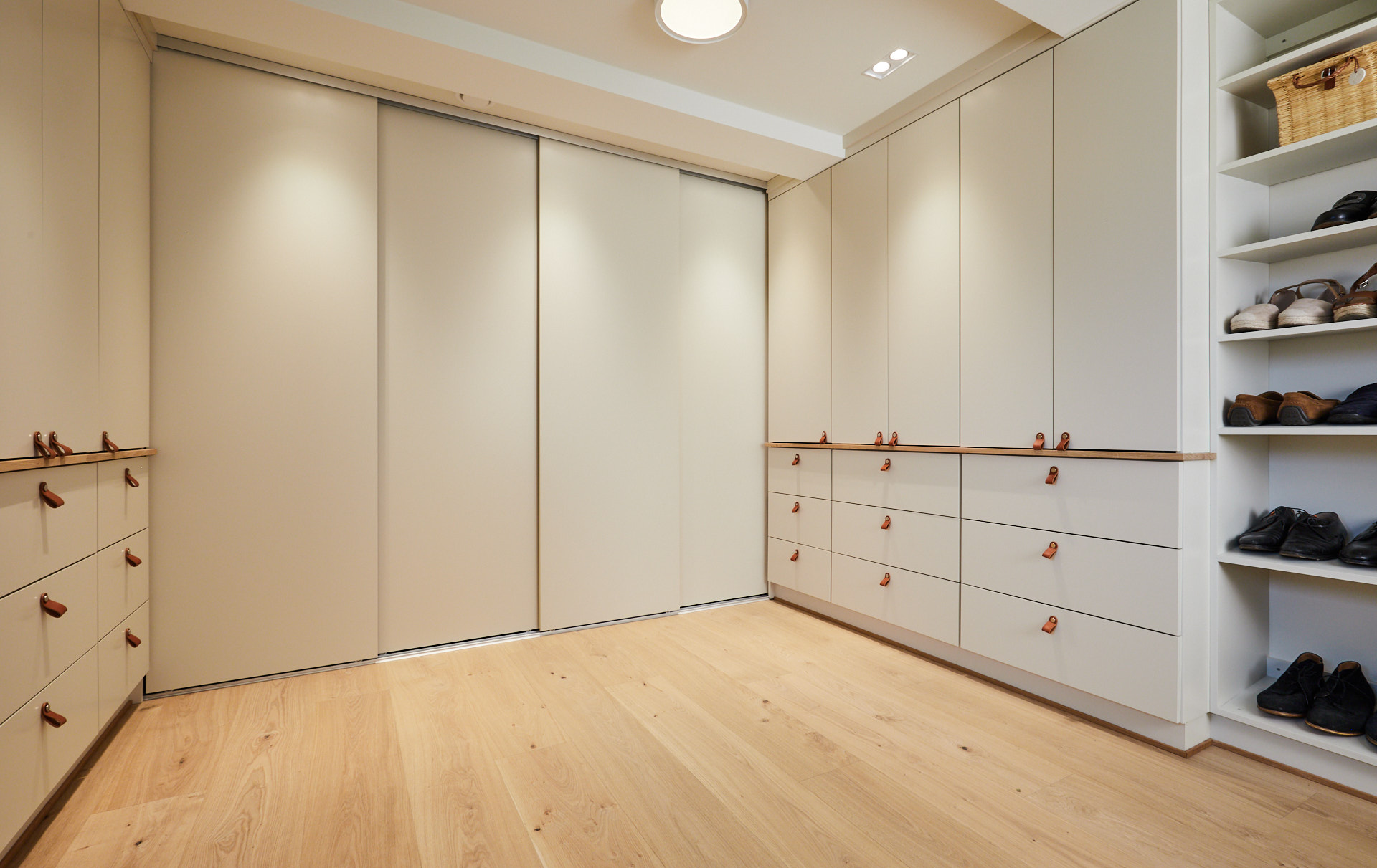 Stort walk-in closet, med rikelig oppbevaringsplass bak skyvedører, skapdører og skuffer laget av valchromat som er malt i fargen vanilje. Skrogene er bygget av kvistfri furu.