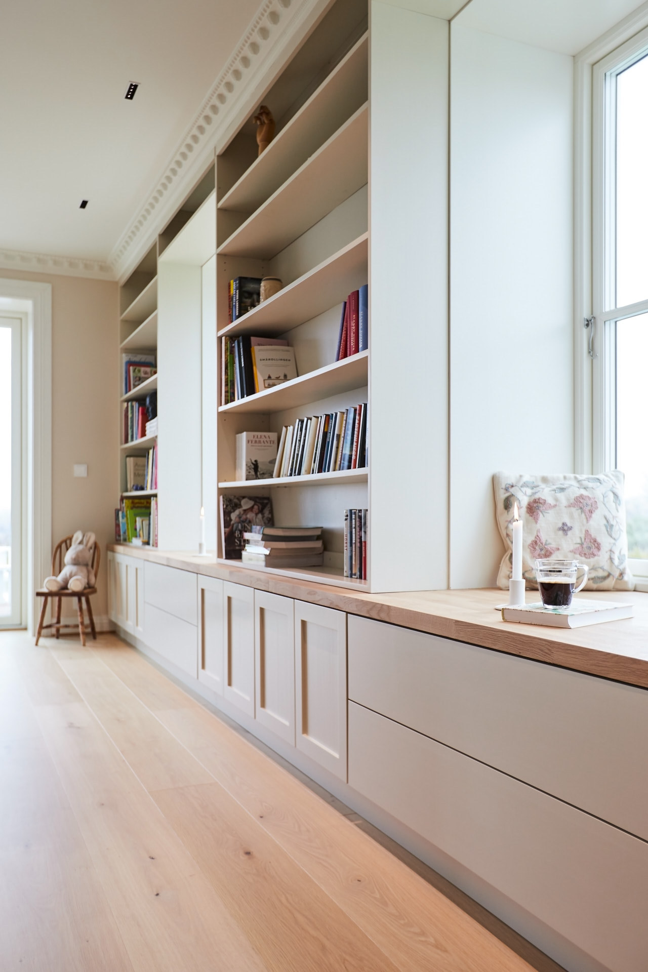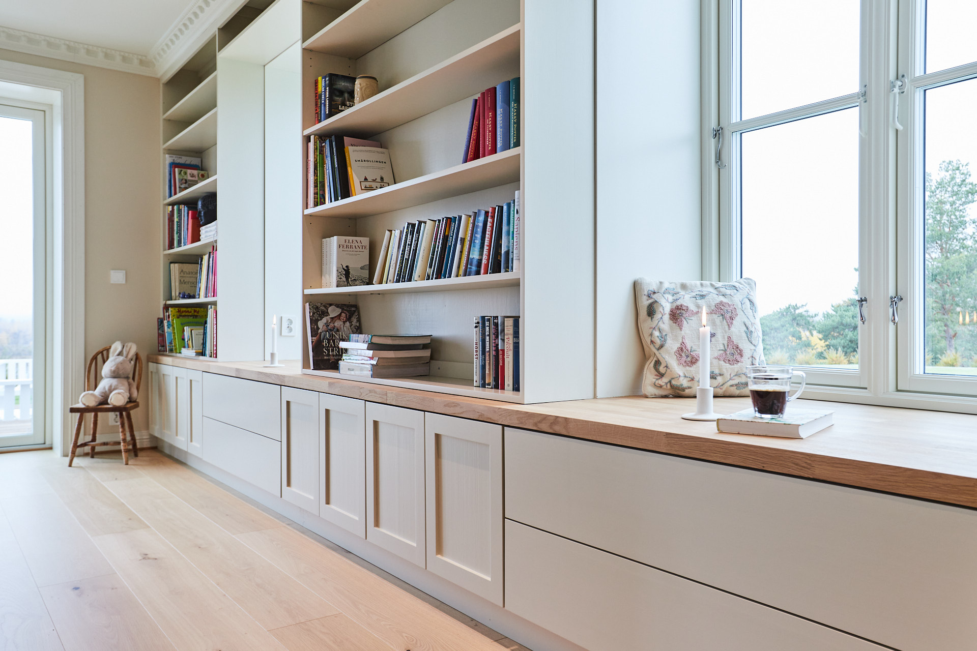 Stor seksjon med kombinert bokhylle og sittebenk ved vindu. Bygget fra vegg til vegg i stua. Skapdører og skrog av kvistfri furu og skuffefrontene av vachromat. Alt malt i fargen vanilje, med benkeplate av Osmobehandlet eik.