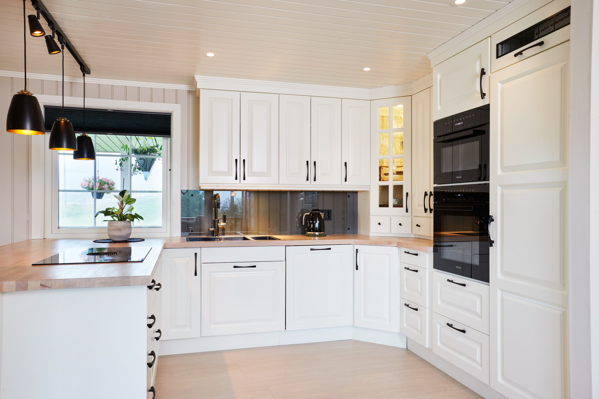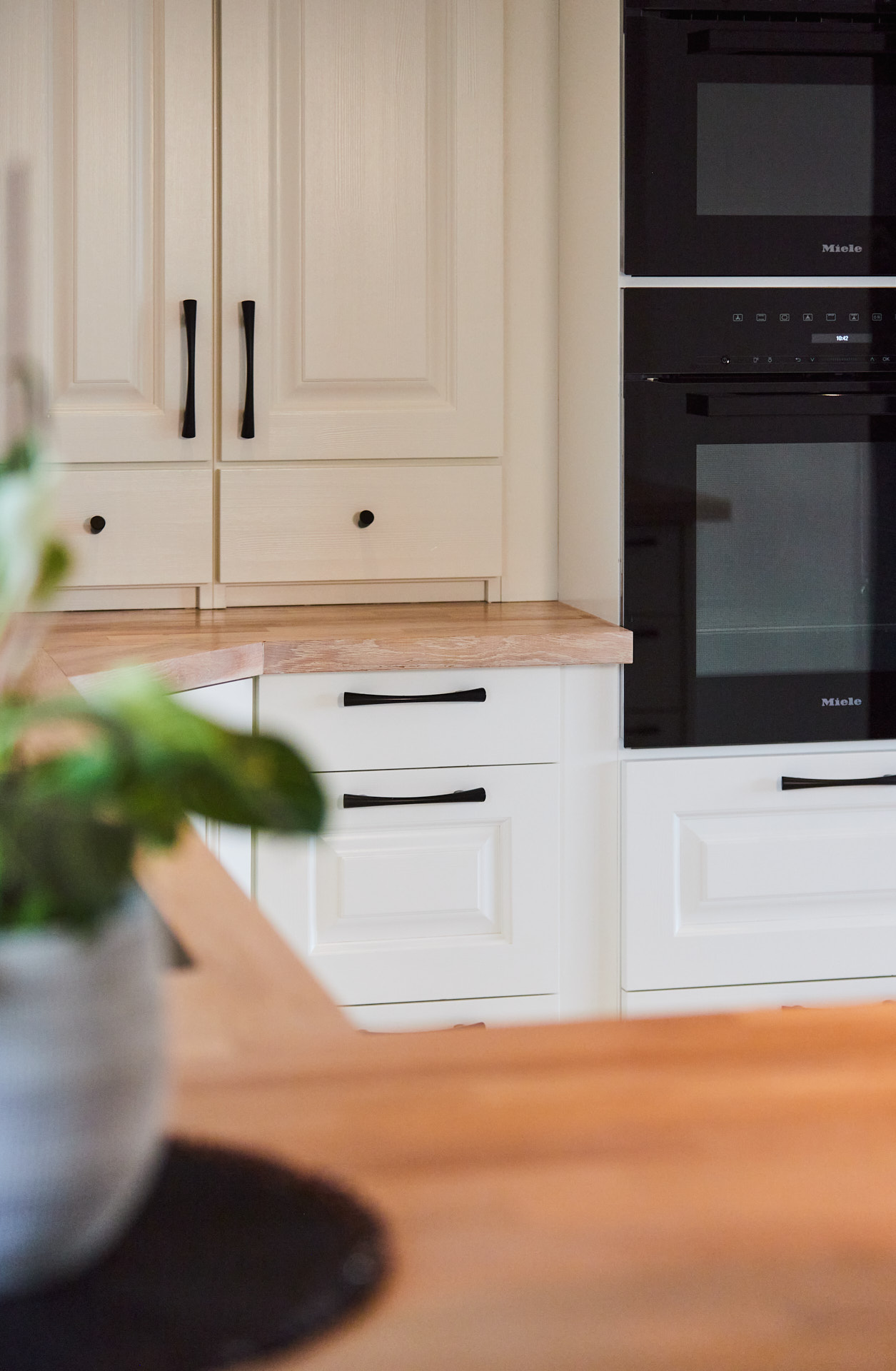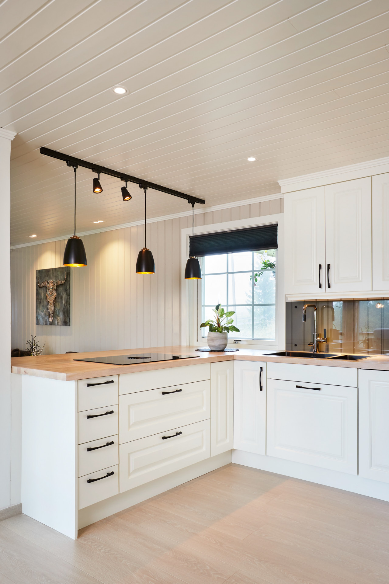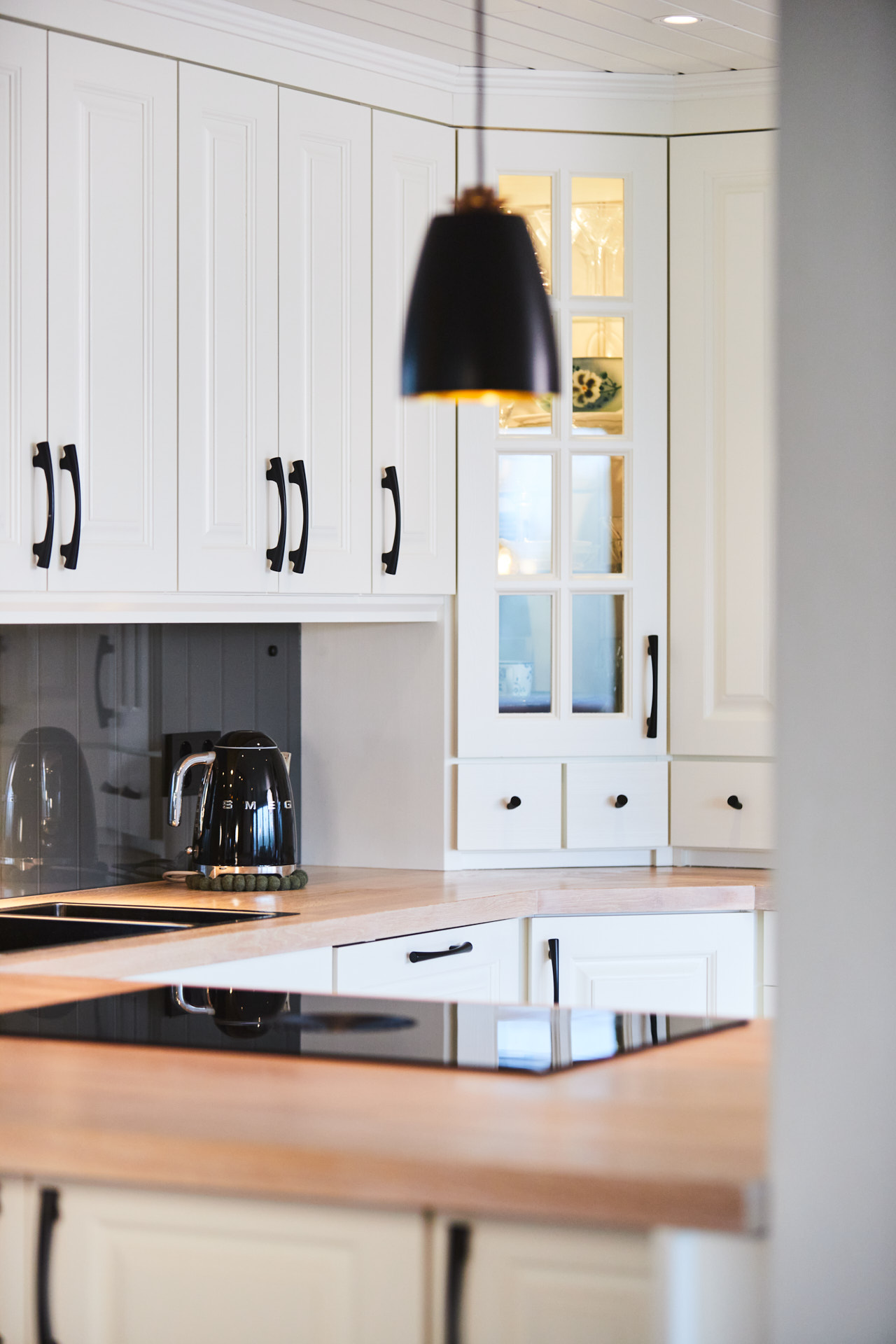 Her går kjøkkenskapene til taket og man har rikelig med oppbevaringsmuligheter både i skap over benk og under benk. Som alle kjøkken vi lager, er også dette i heltre, kvistfri furu, her malt i fargen bomull. Bora platetopp med integrert ventilator fra Bergro, sikrer et ryddig uttrykk på benkområdet. Profilen på skapdørene er en klassisk profil, som vi kaller "Dokken".