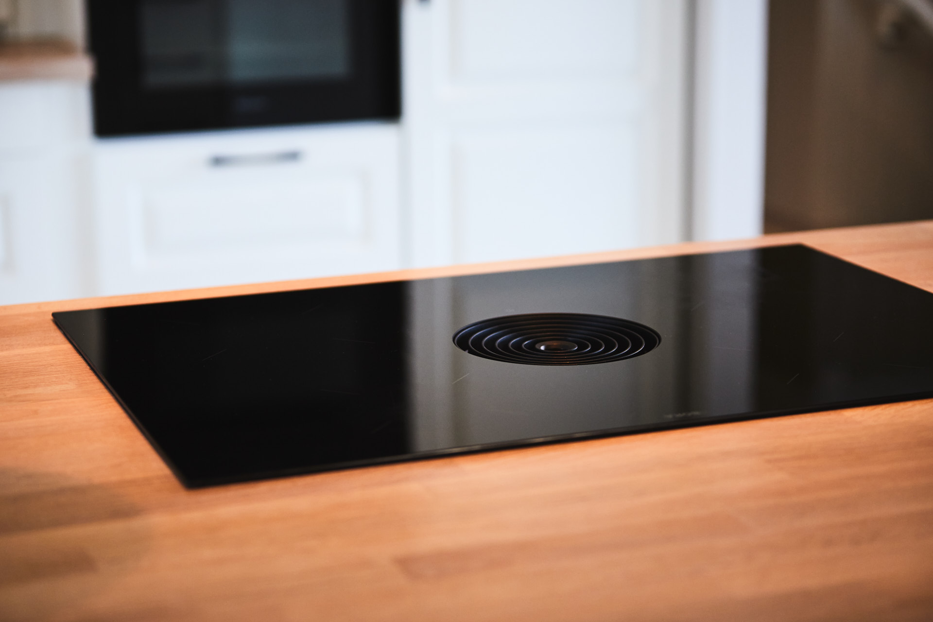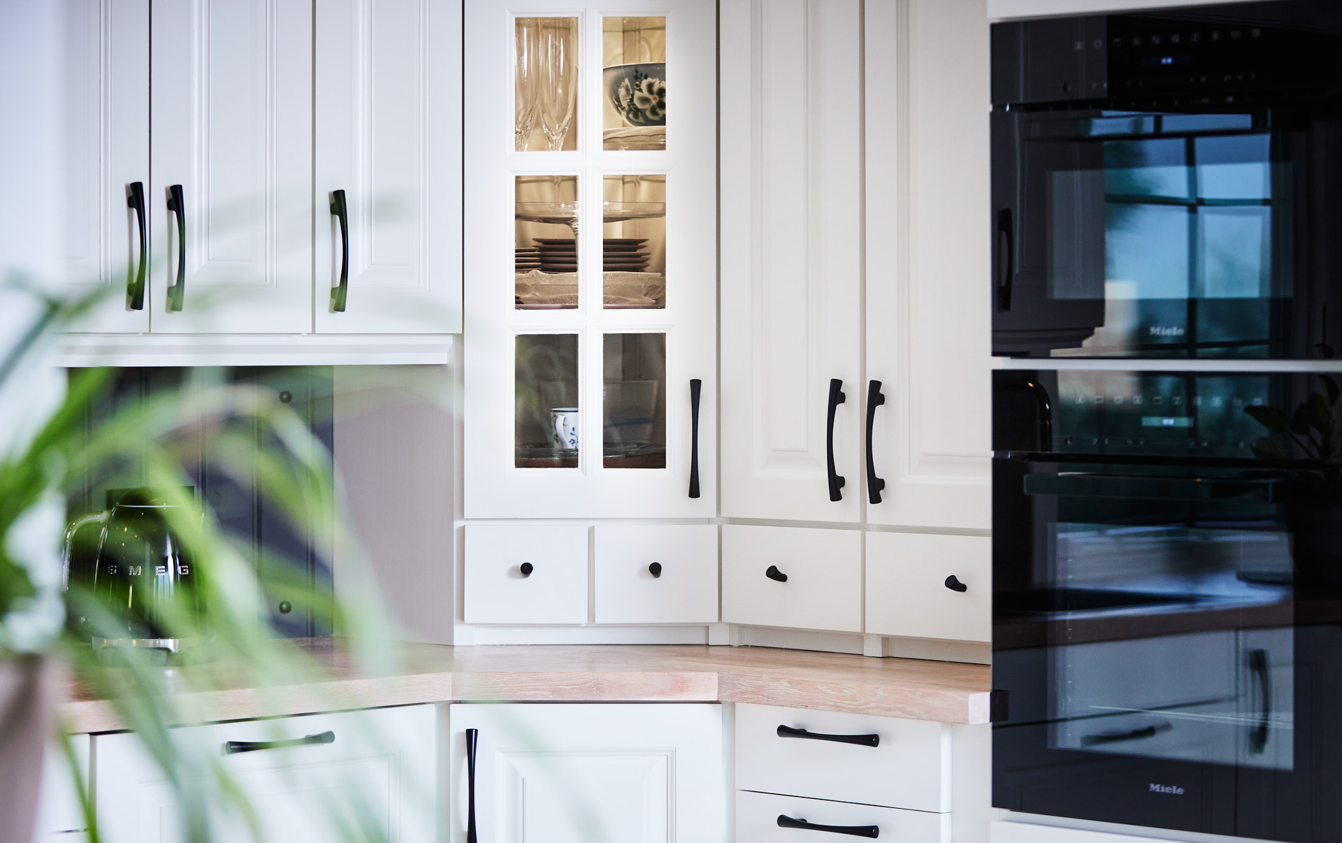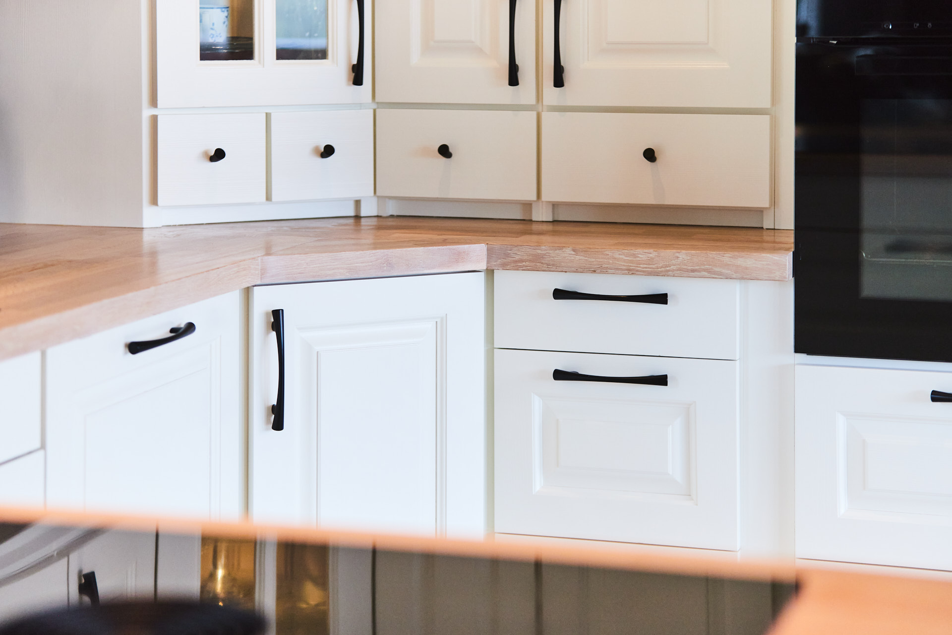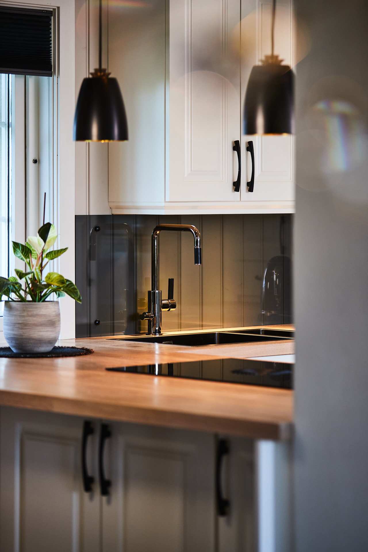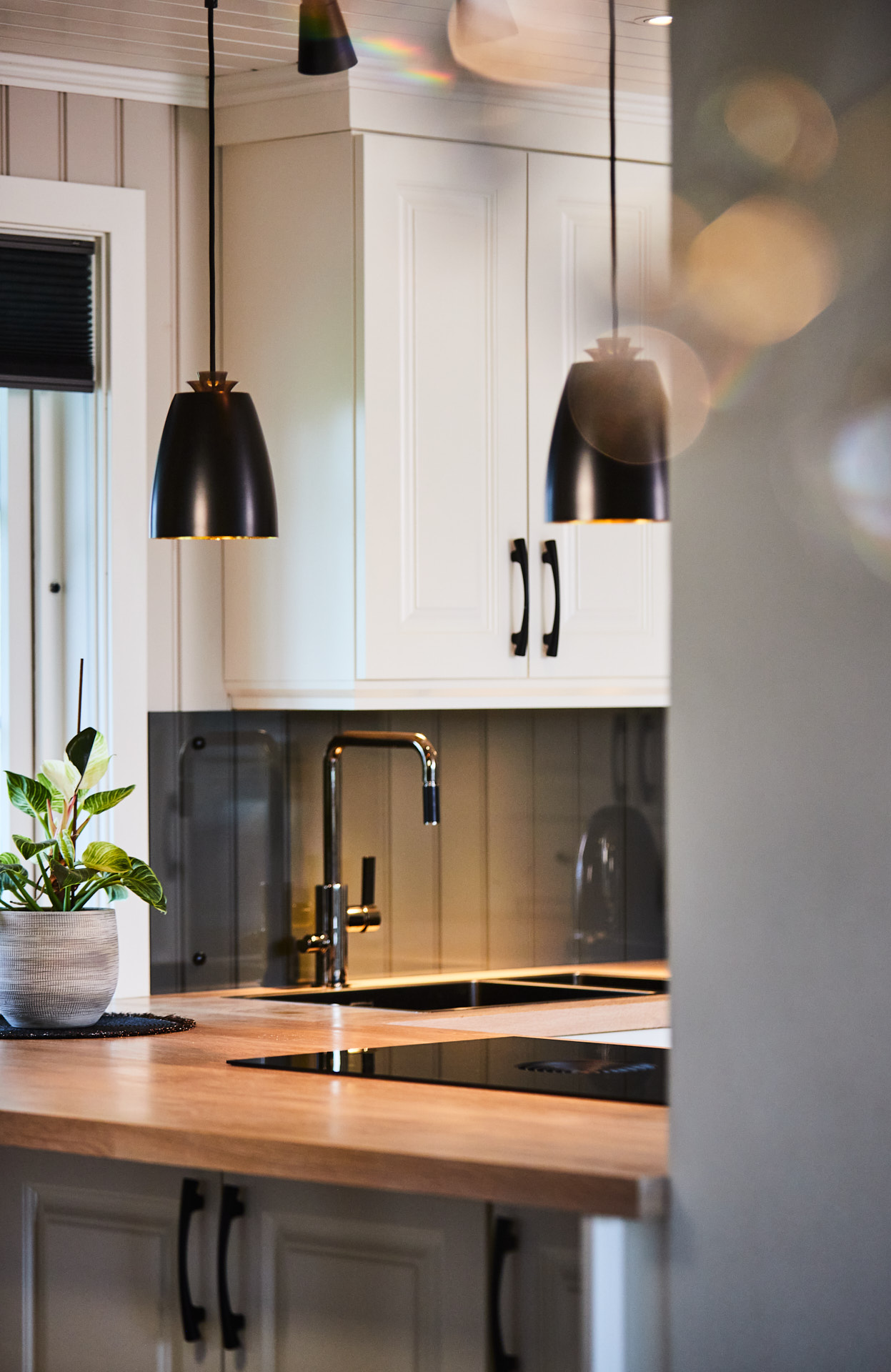 Her går kjøkkenskapene til taket og man har rikelig med oppbevaringsmuligheter både i skap over benk og under benk. Som alle kjøkken vi lager, er også dette i heltre, kvistfri furu, her malt i fargen bomull. Bora platetopp med integrert ventilator fra Bergro, sikrer et ryddig uttrykk på benkområdet. Profilen på skapdørene er en klassisk profil, som vi kaller "Dokken".