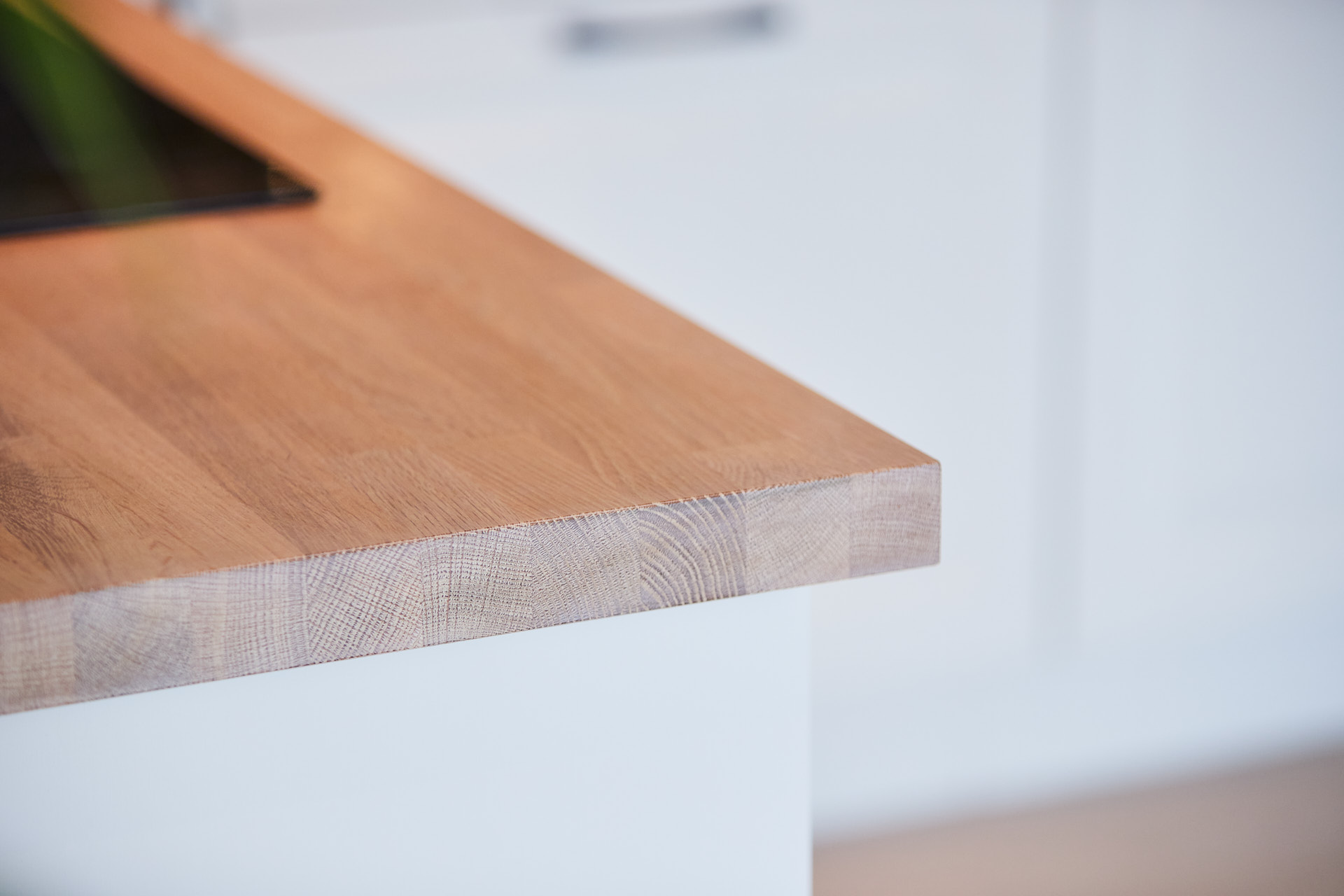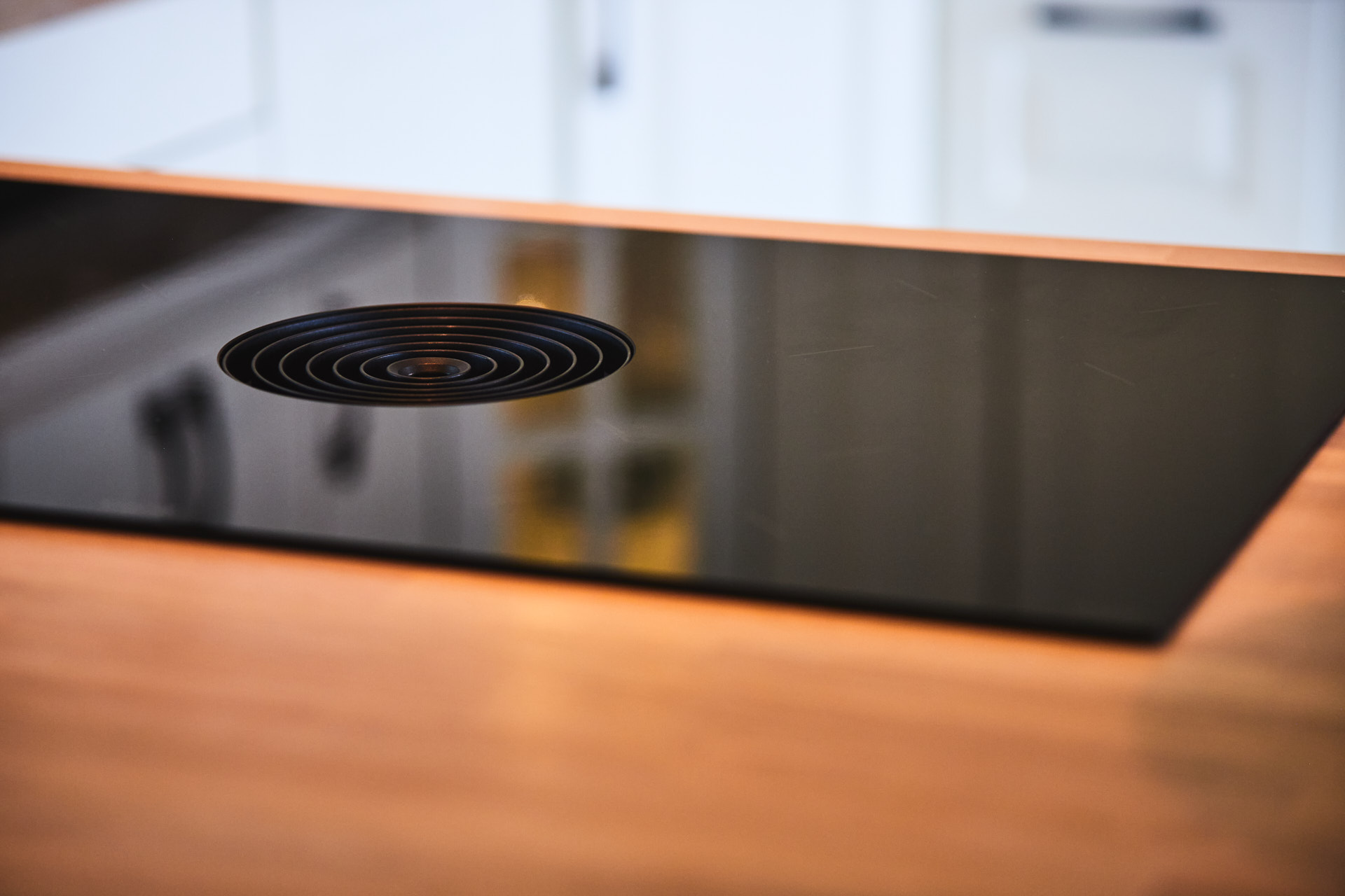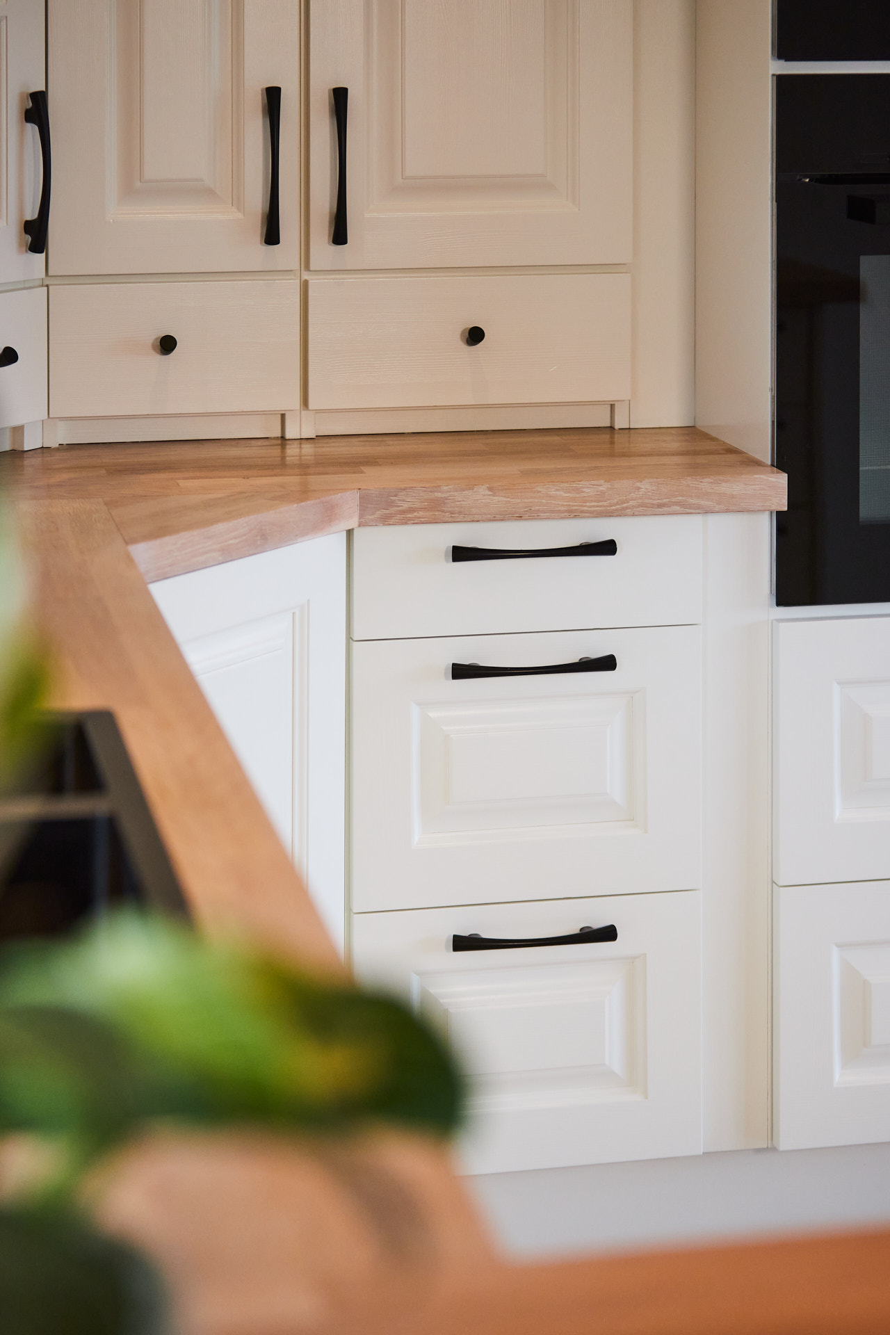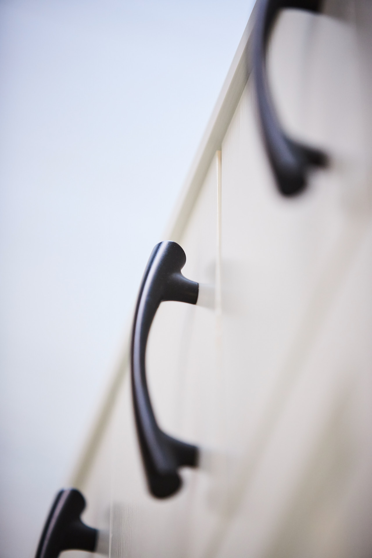 Her går kjøkkenskapene til taket og man har rikelig med oppbevaringsmuligheter både i skap over benk og under benk. Som alle kjøkken vi lager, er også dette i heltre, kvistfri furu, her malt i fargen bomull. Bora platetopp med integrert ventilator fra Bergro, sikrer et ryddig uttrykk på benkområdet. Profilen på skapdørene er en klassisk profil, som vi kaller "Dokken".