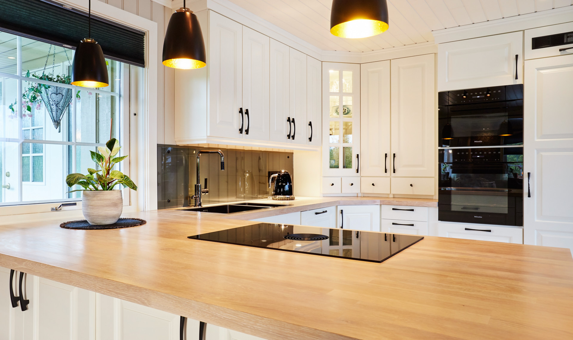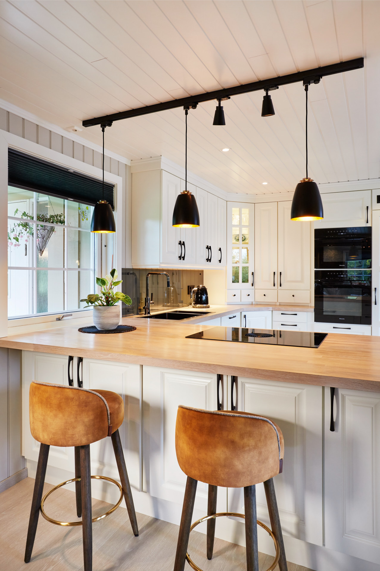 Lys og klassisk stil på mellomstort kjøkken. Kjøkkenbenken har sitteplasser og danner en naturlig romdeling mot stua i huset.