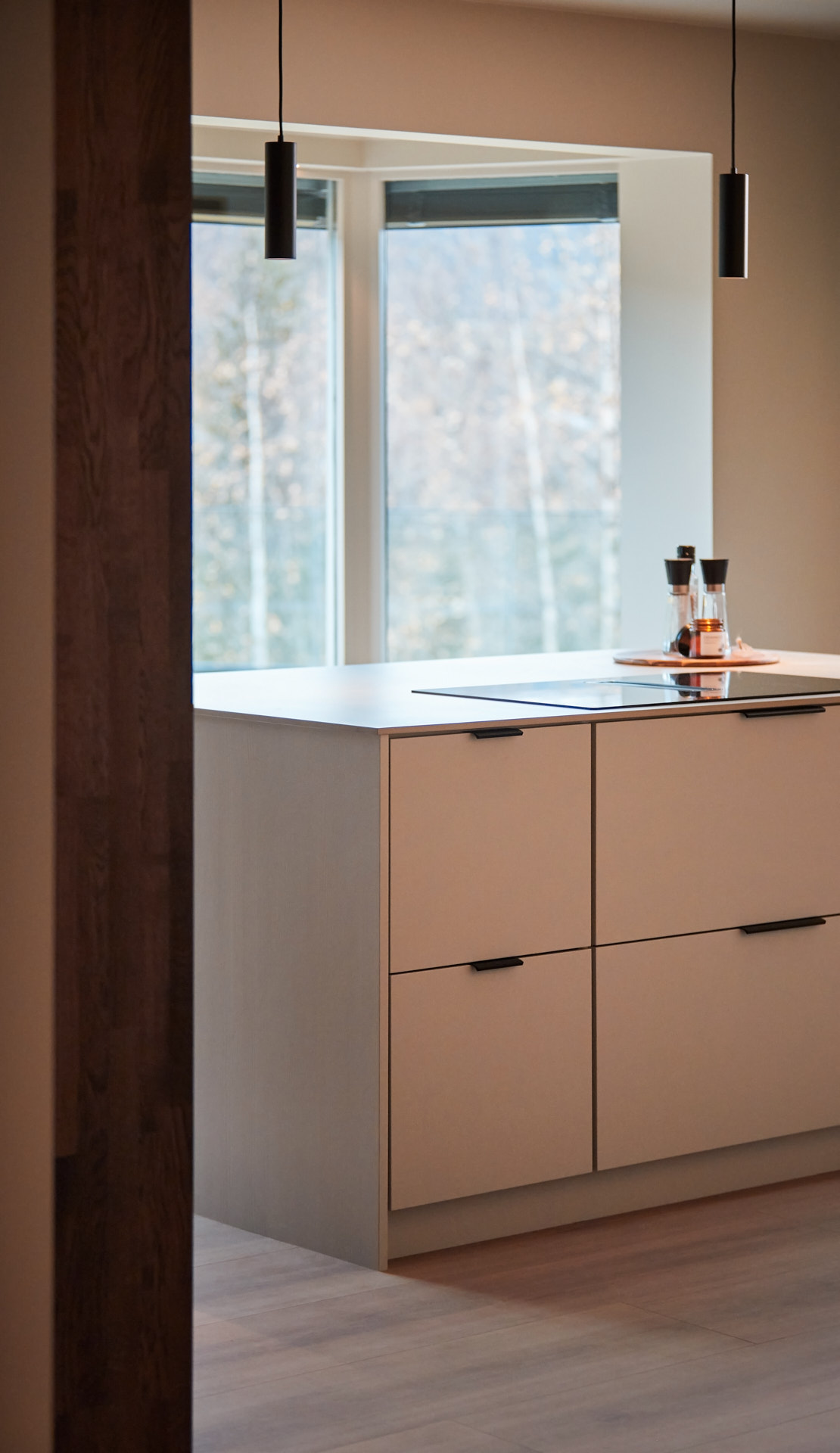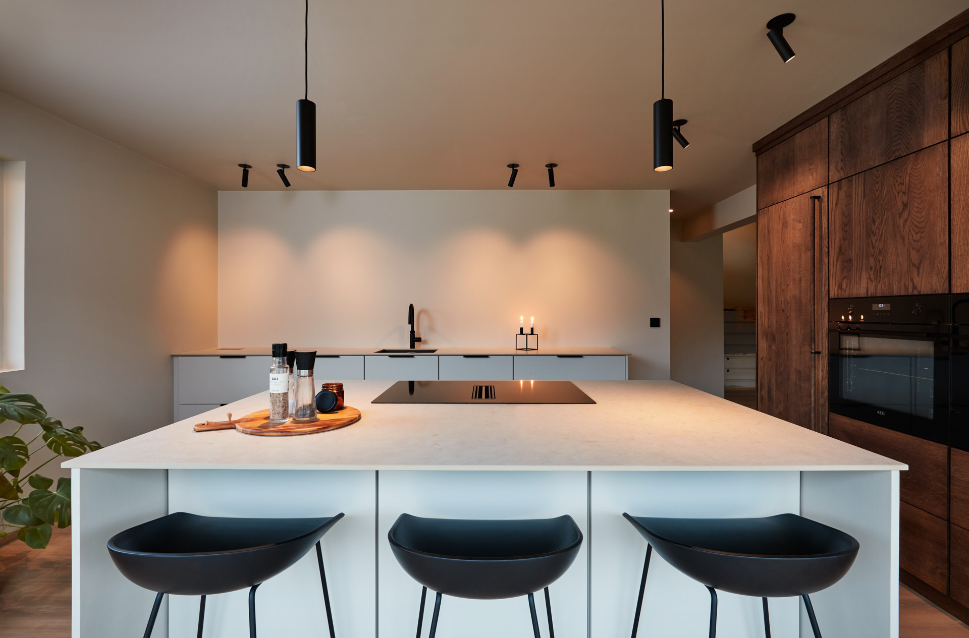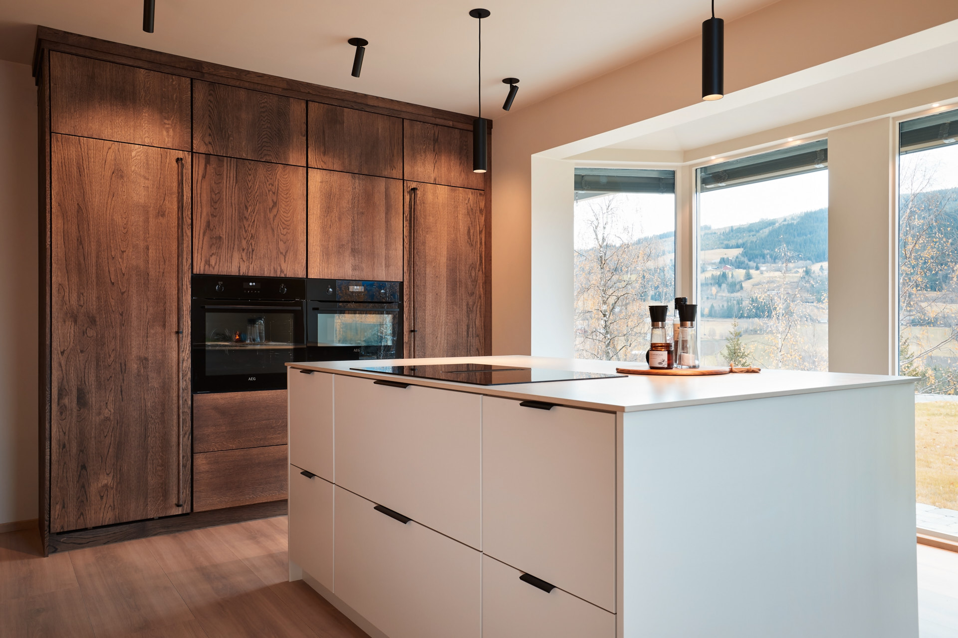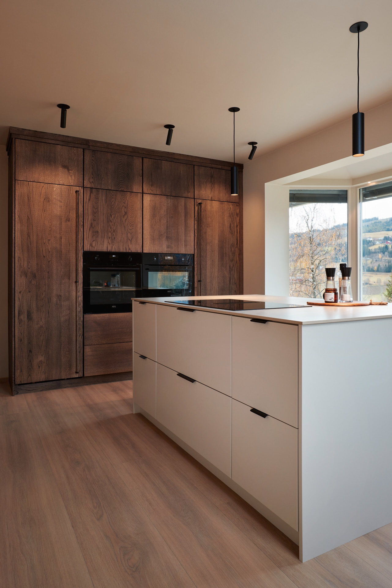 Moderne og minimalistisk kjøkken i lyse farger og eik. Et kjøkken som gir en følelse av oversikt og ro.