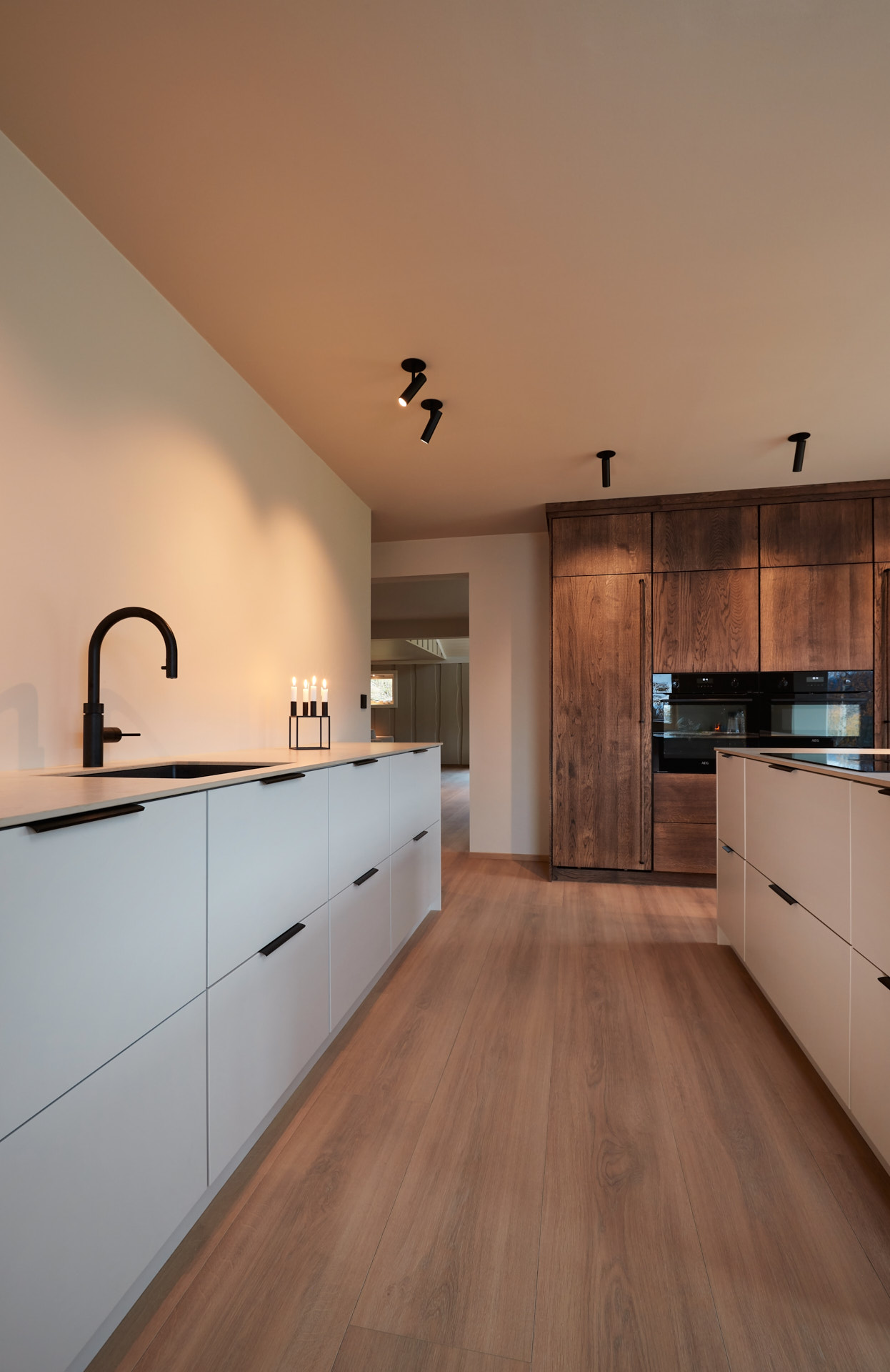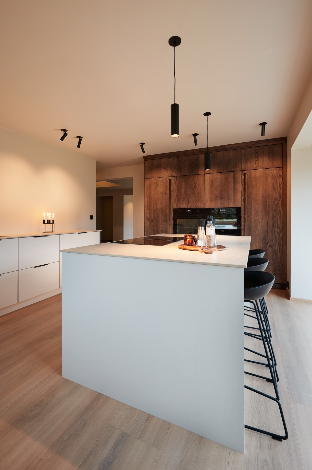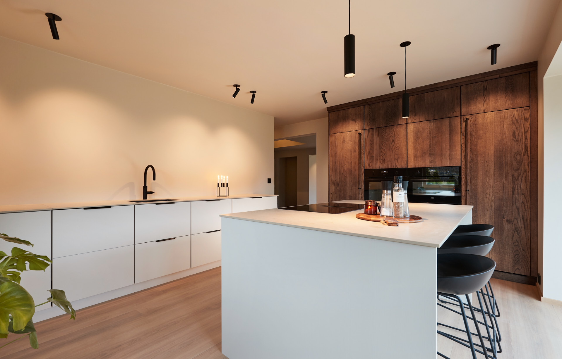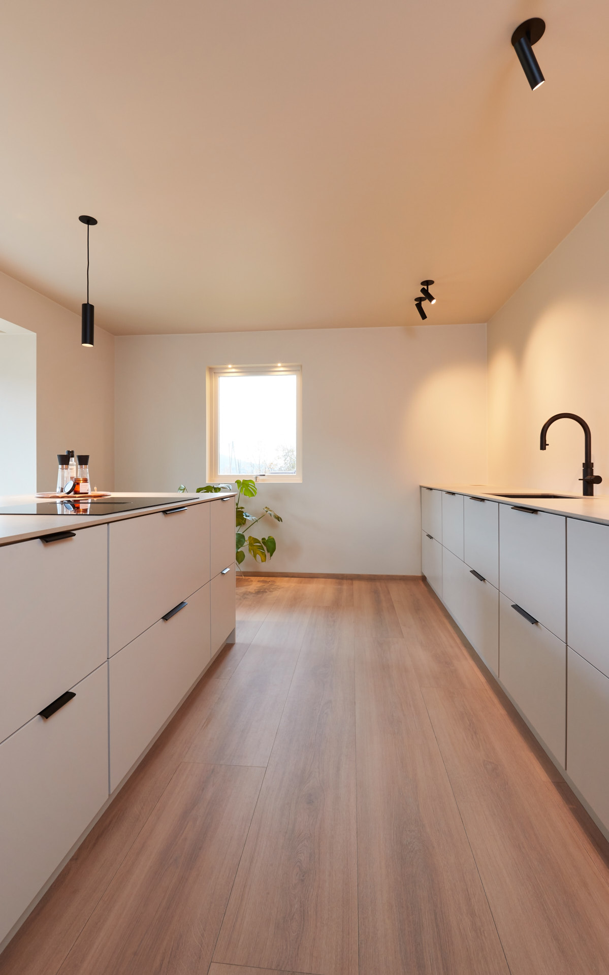 Moderne og minimalistisk kjøkken i lyse farger og eik. Et kjøkken som gir en følelse av oversikt og ro.