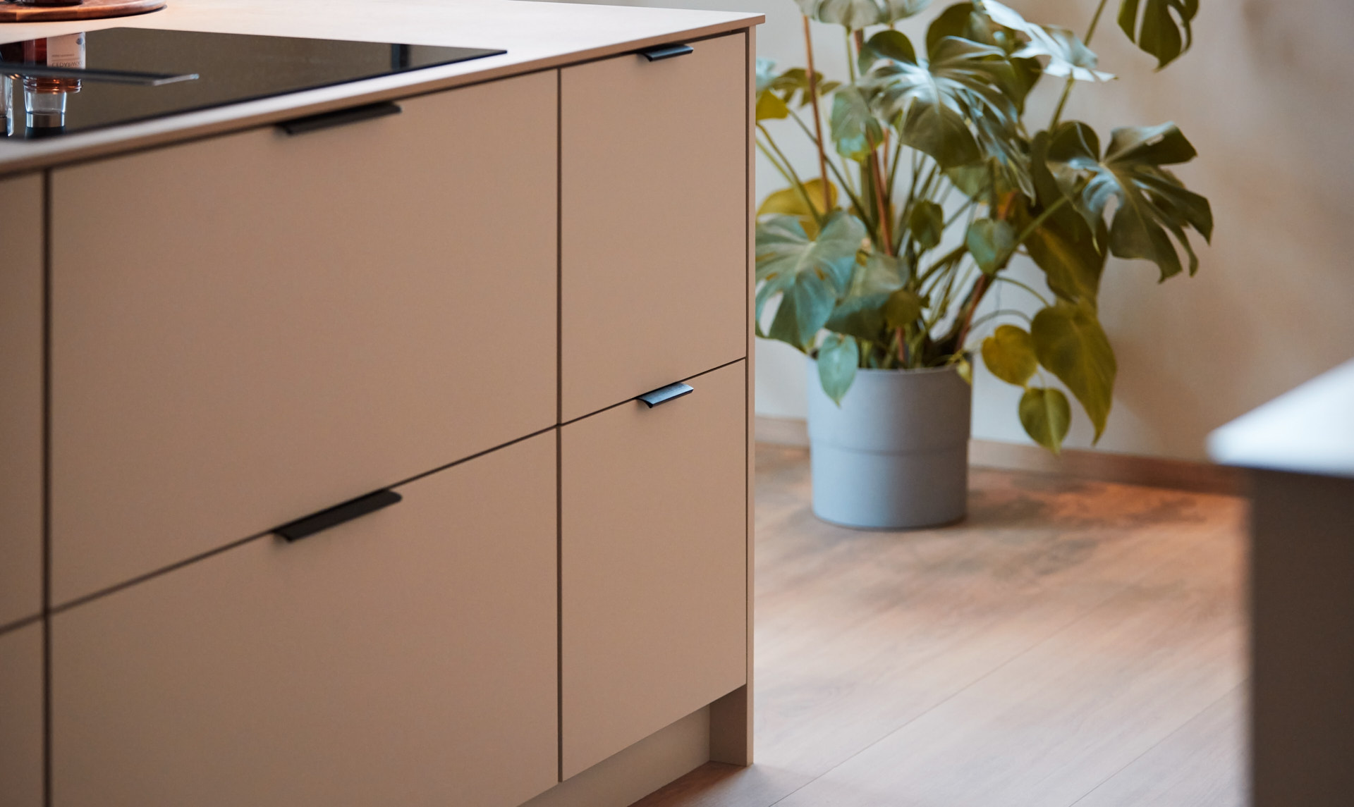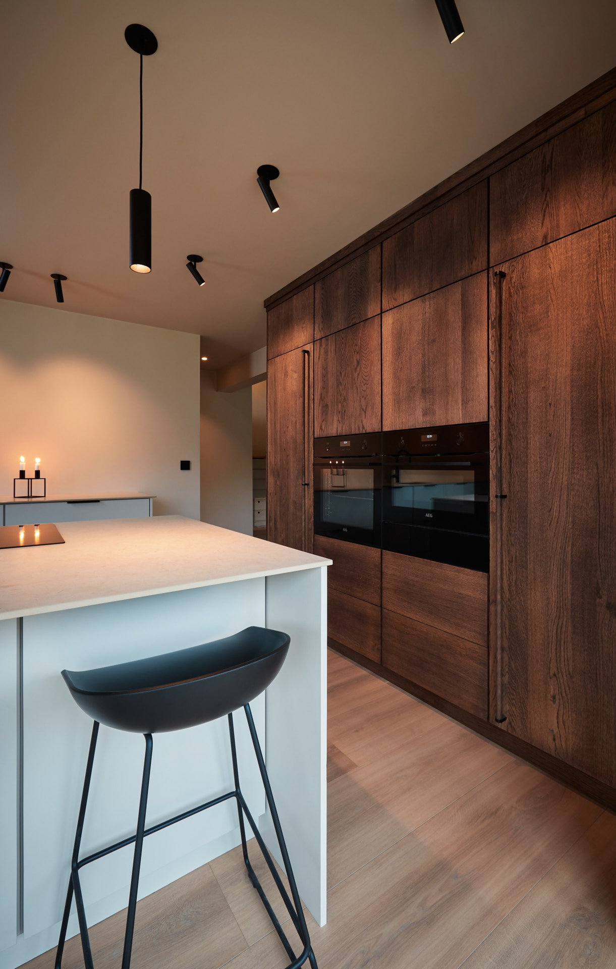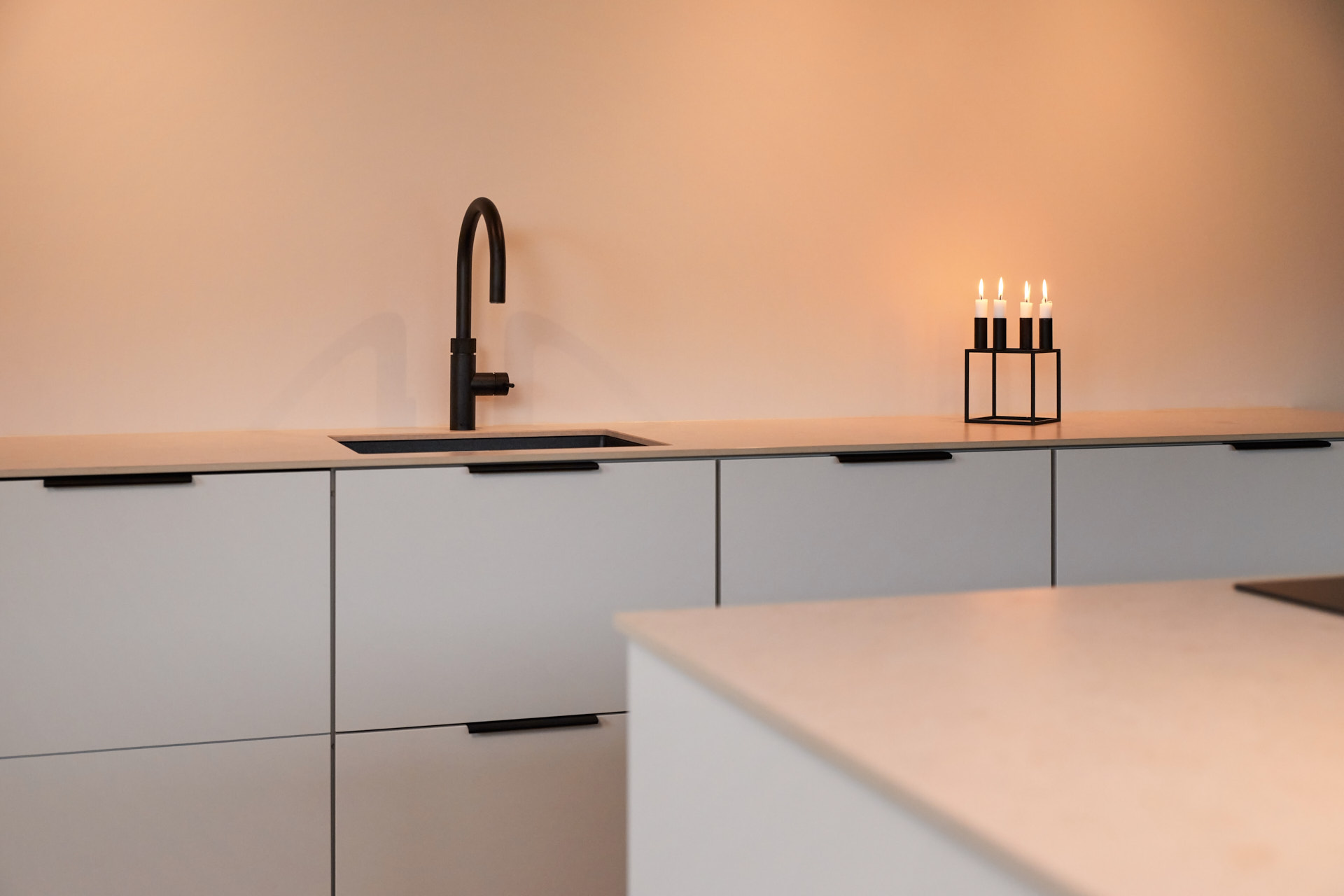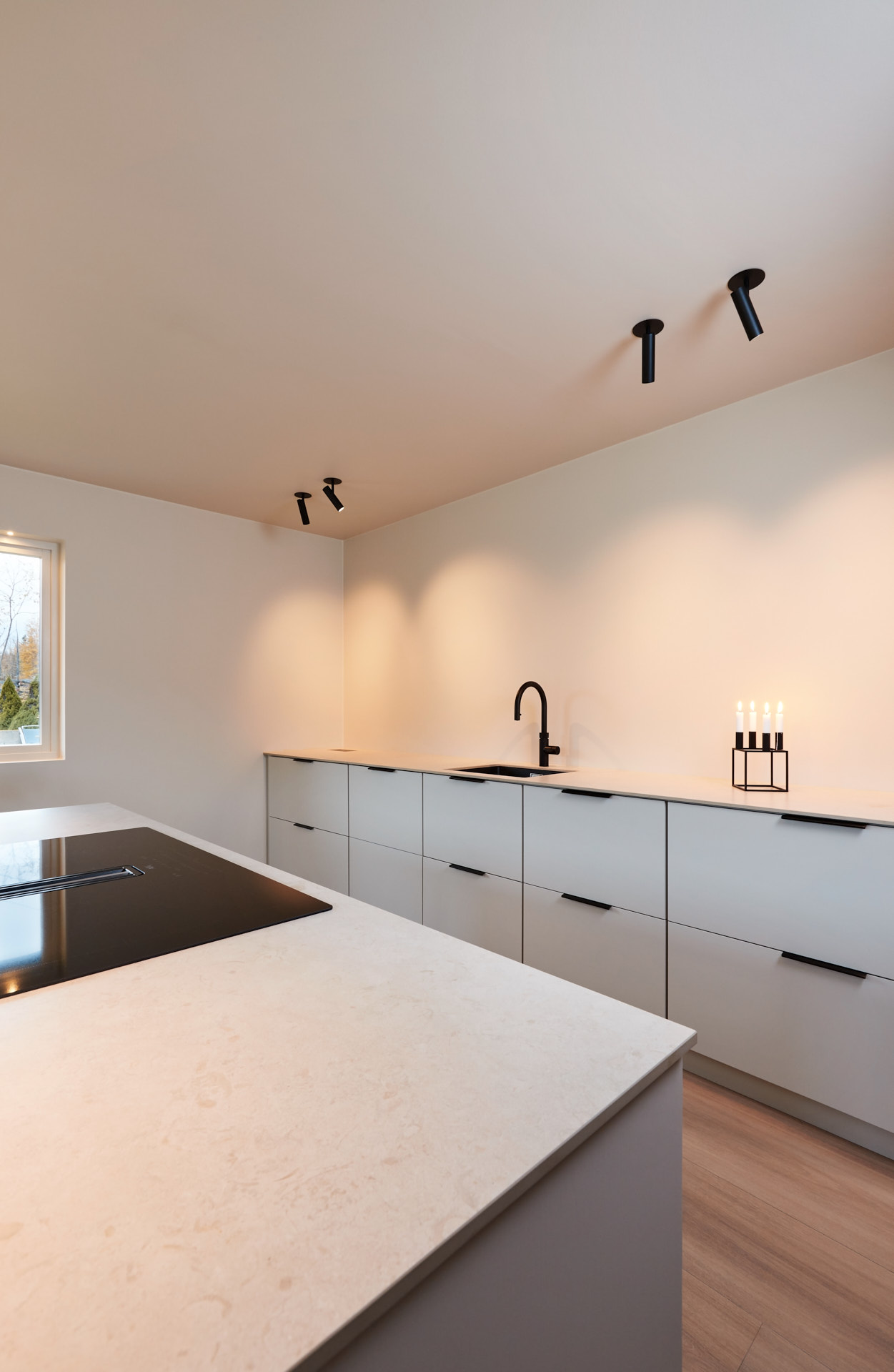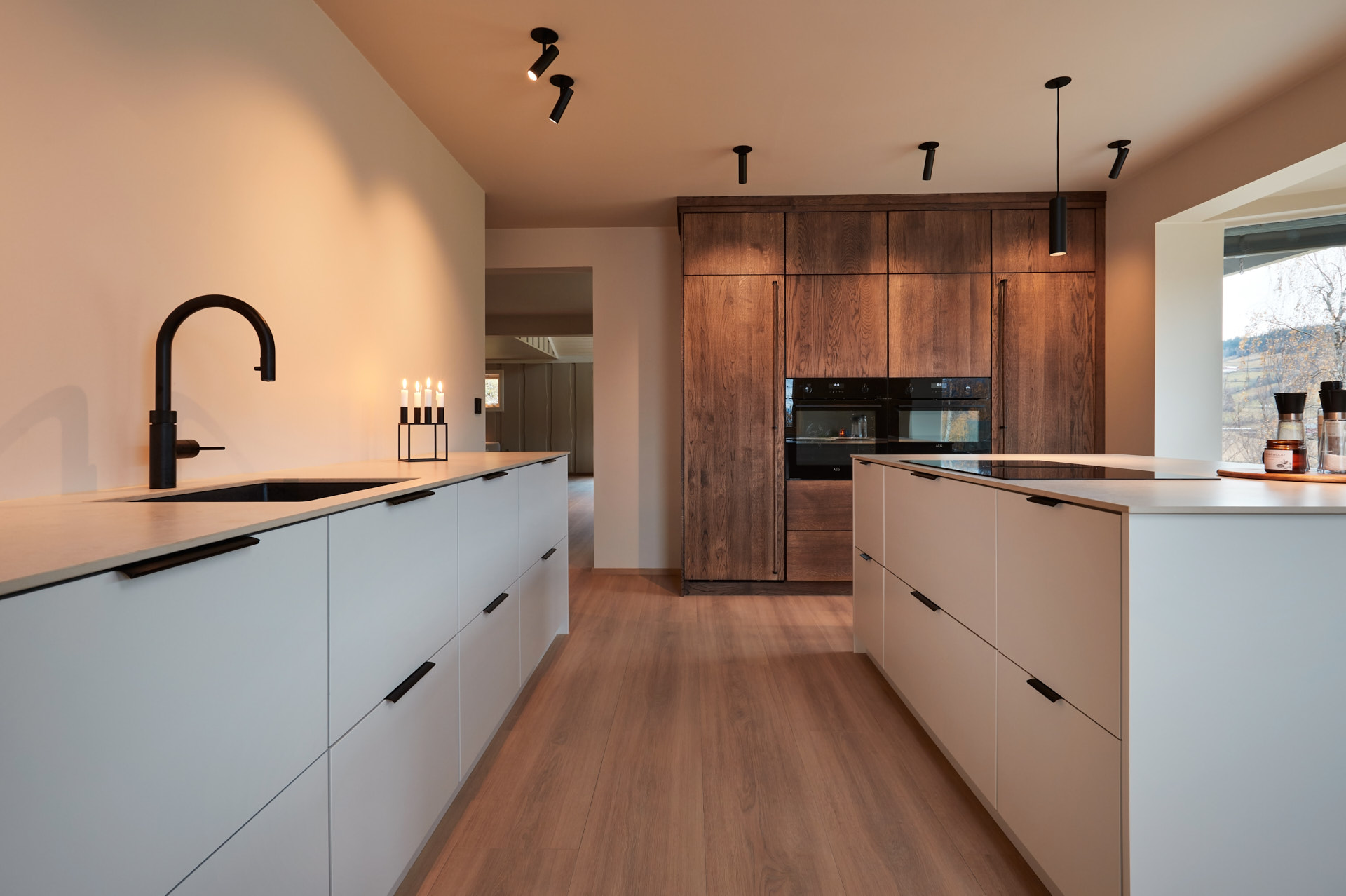 Moderne og minimalistisk kjøkken i lyse farger og eik. Et kjøkken som gir en følelse av oversikt og ro.