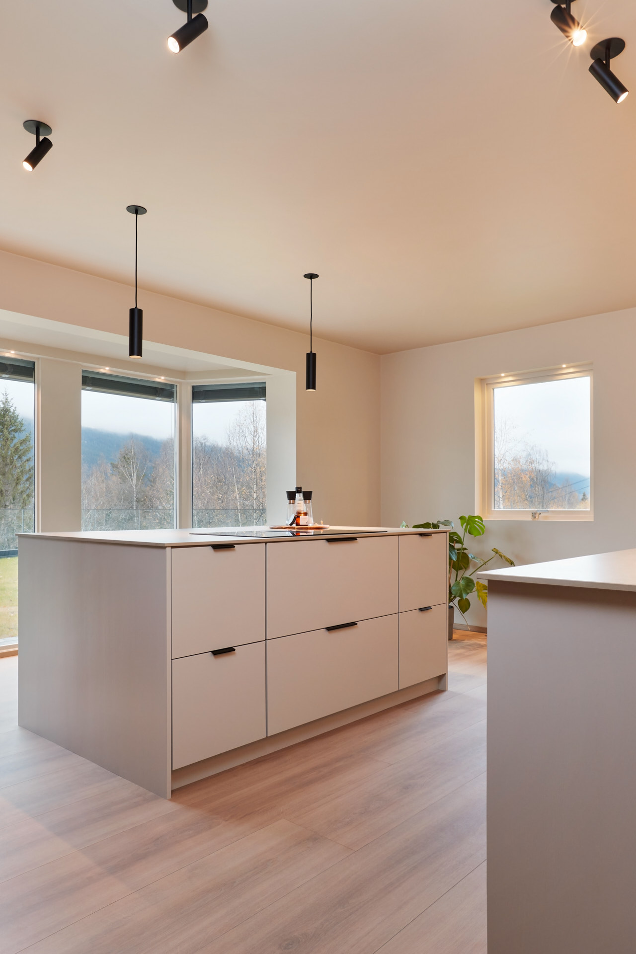 Store, rene benkeflater kombinert med høyskapsrekke av eik. Kjøkkenøya har skuffer og skap på begge sider, samt sitteplass til tre. Skrog er laget av kvistfri furu. Fronter og dører av valchromat, alt malt i samme farge. Høyskapene har eikefronter, behandlet med Osmo Ibenholt.