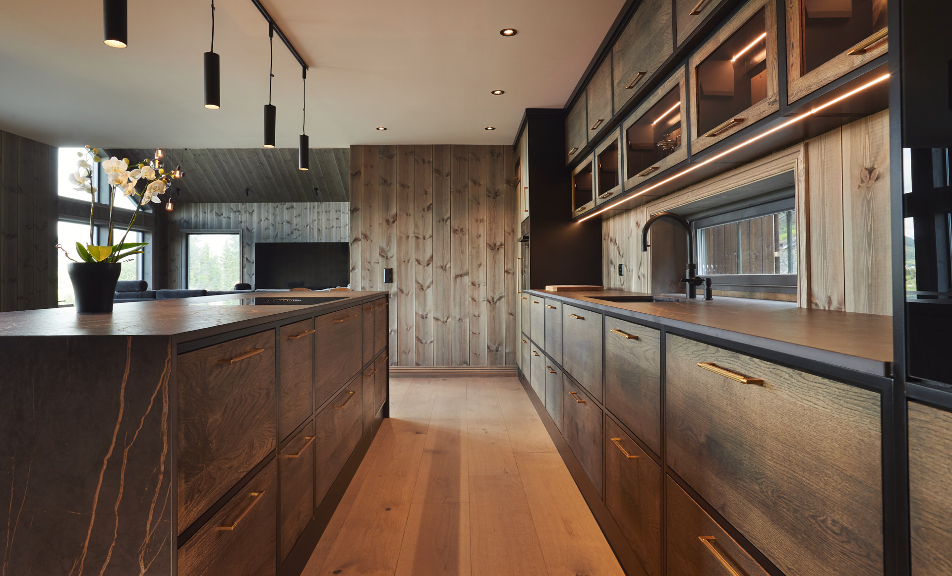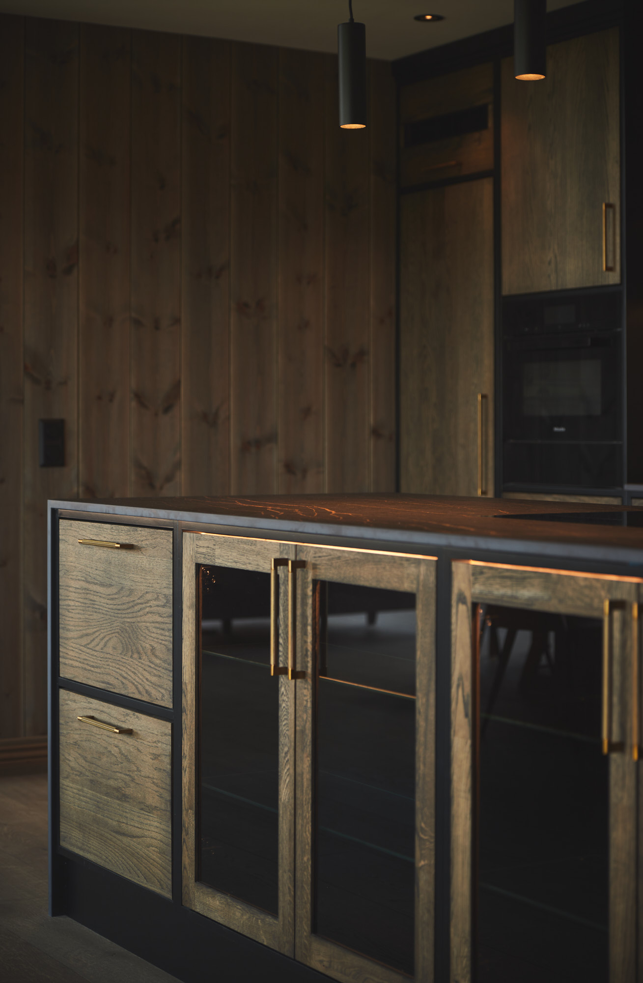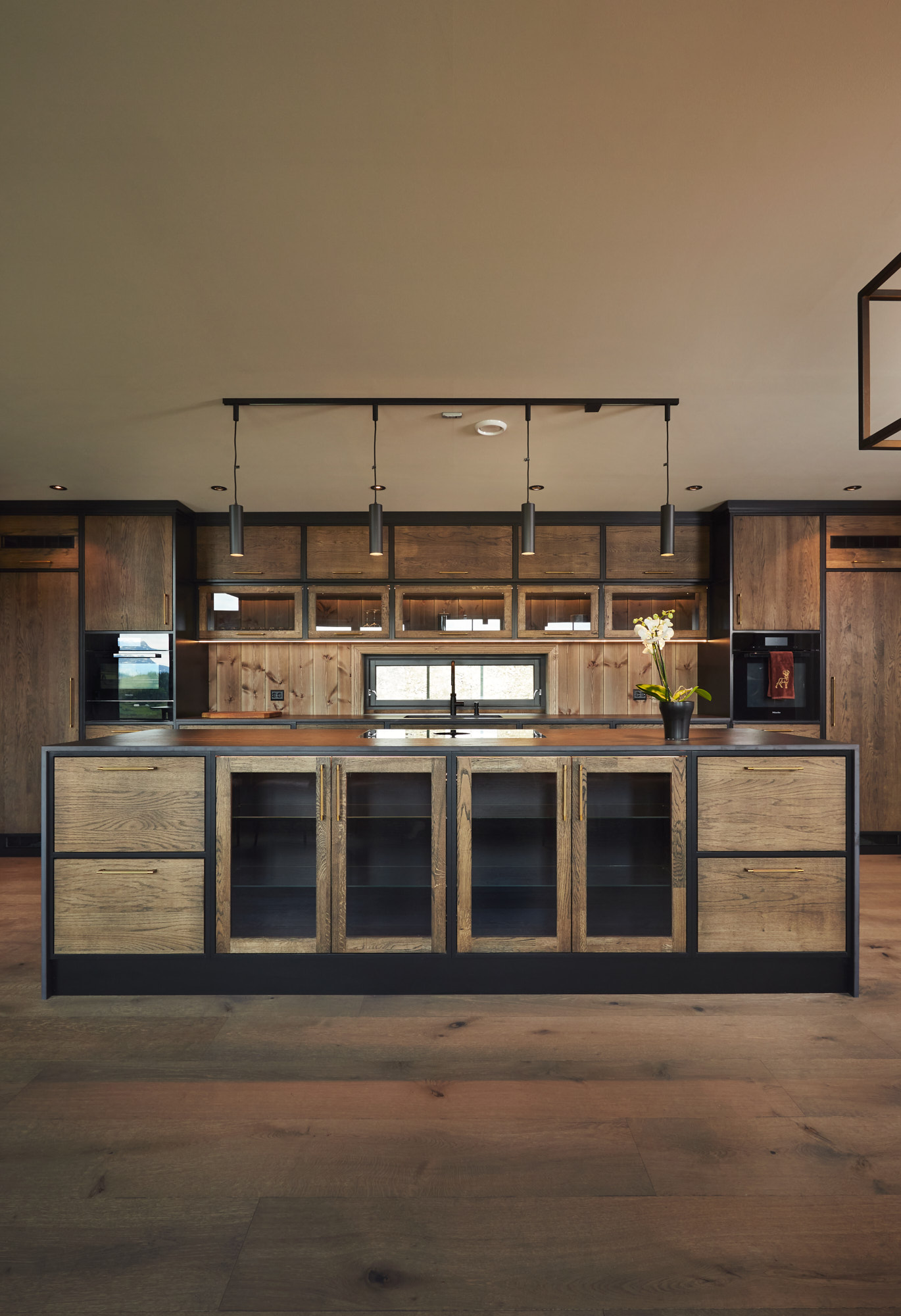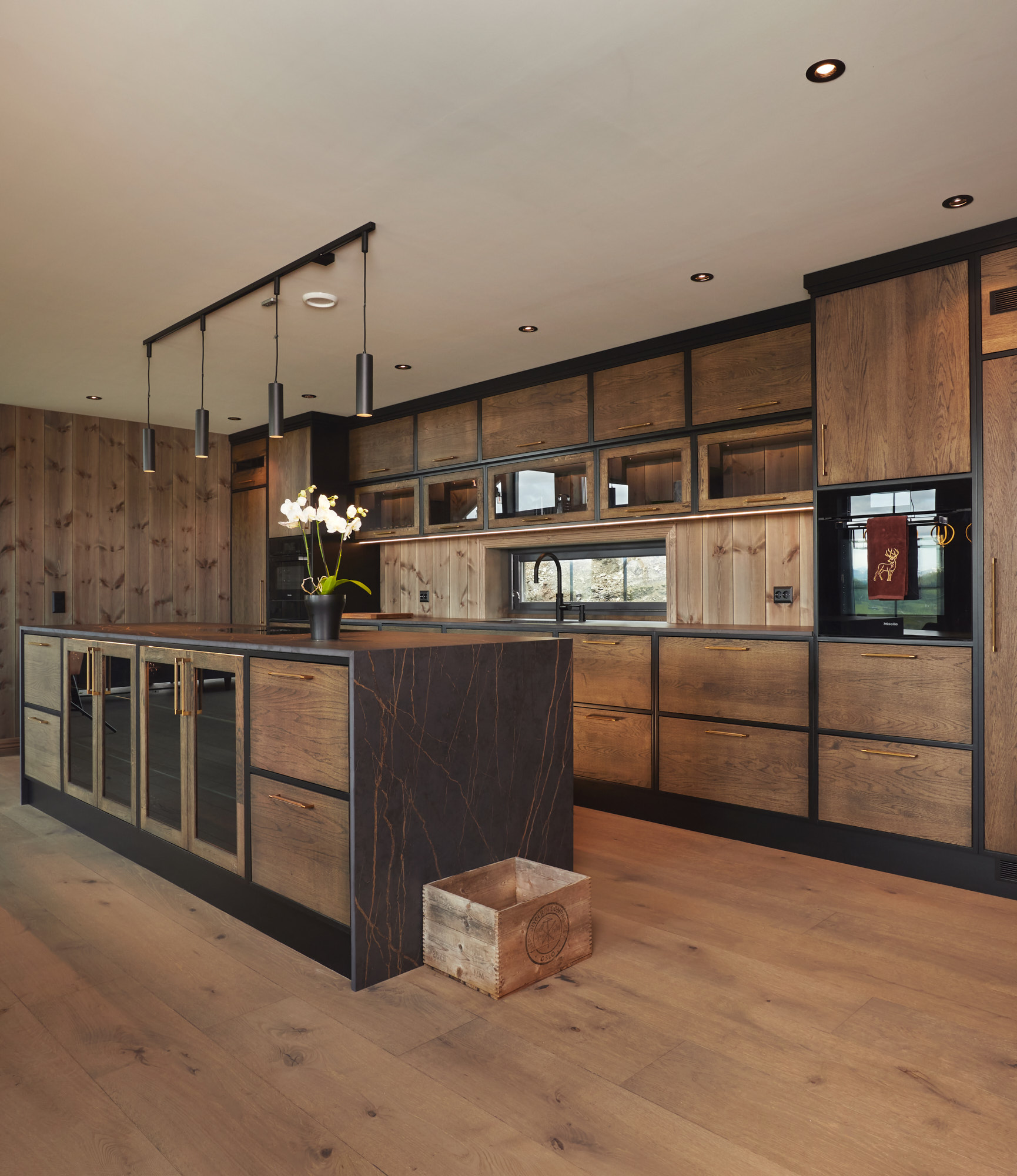 Dette er et stort, romslig og robust kjøkken i symmetrisk oppsett. Skrogene er bygget av kvistfri furu, malt i sort Musta. Kjøkkenfrontene er av 3-lags eik, behandlet med Osmo sort dekorvoks. Kjøkkeninnredning og veggpanel (fra Vyrk) er en perfekt match!