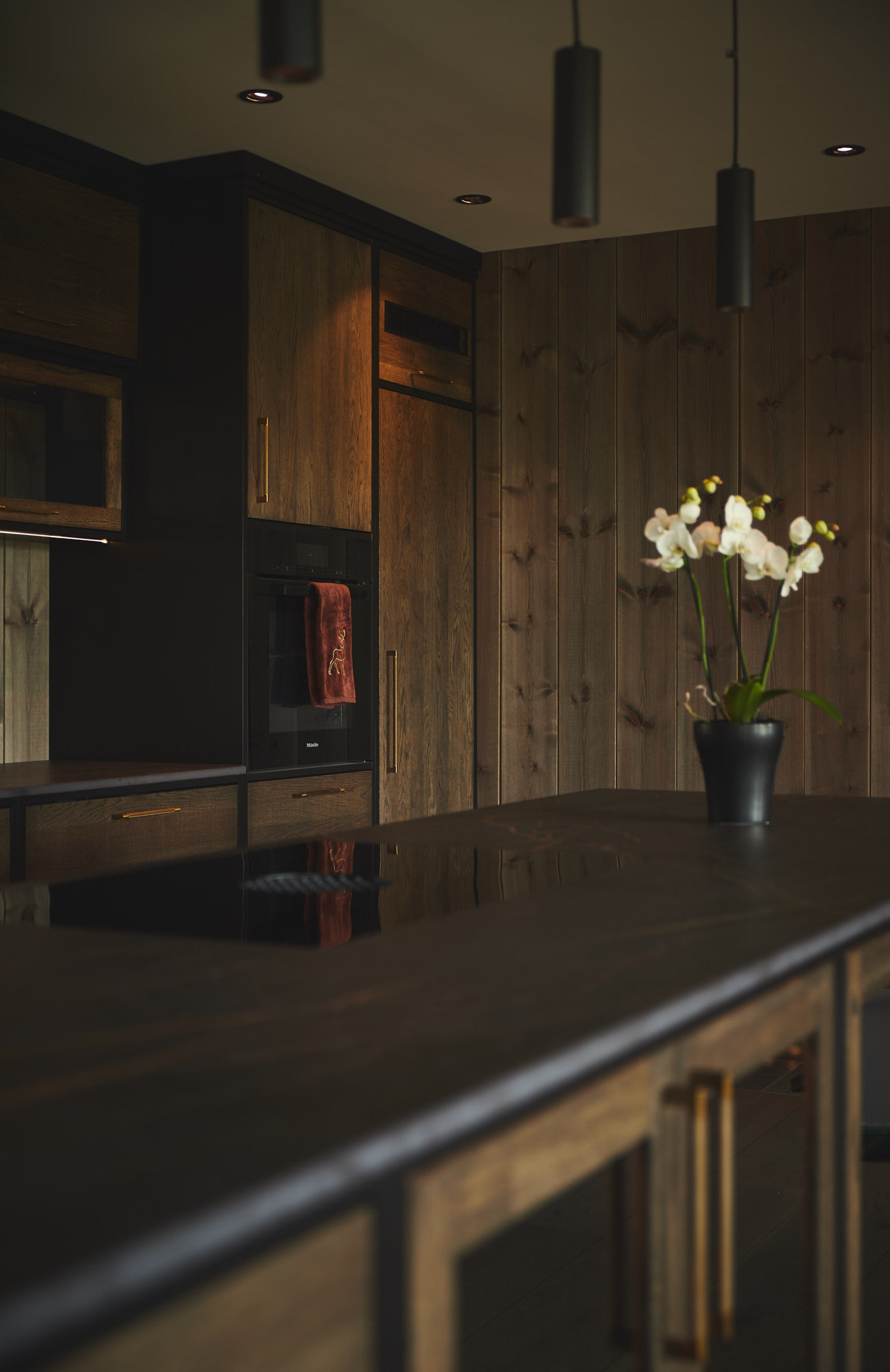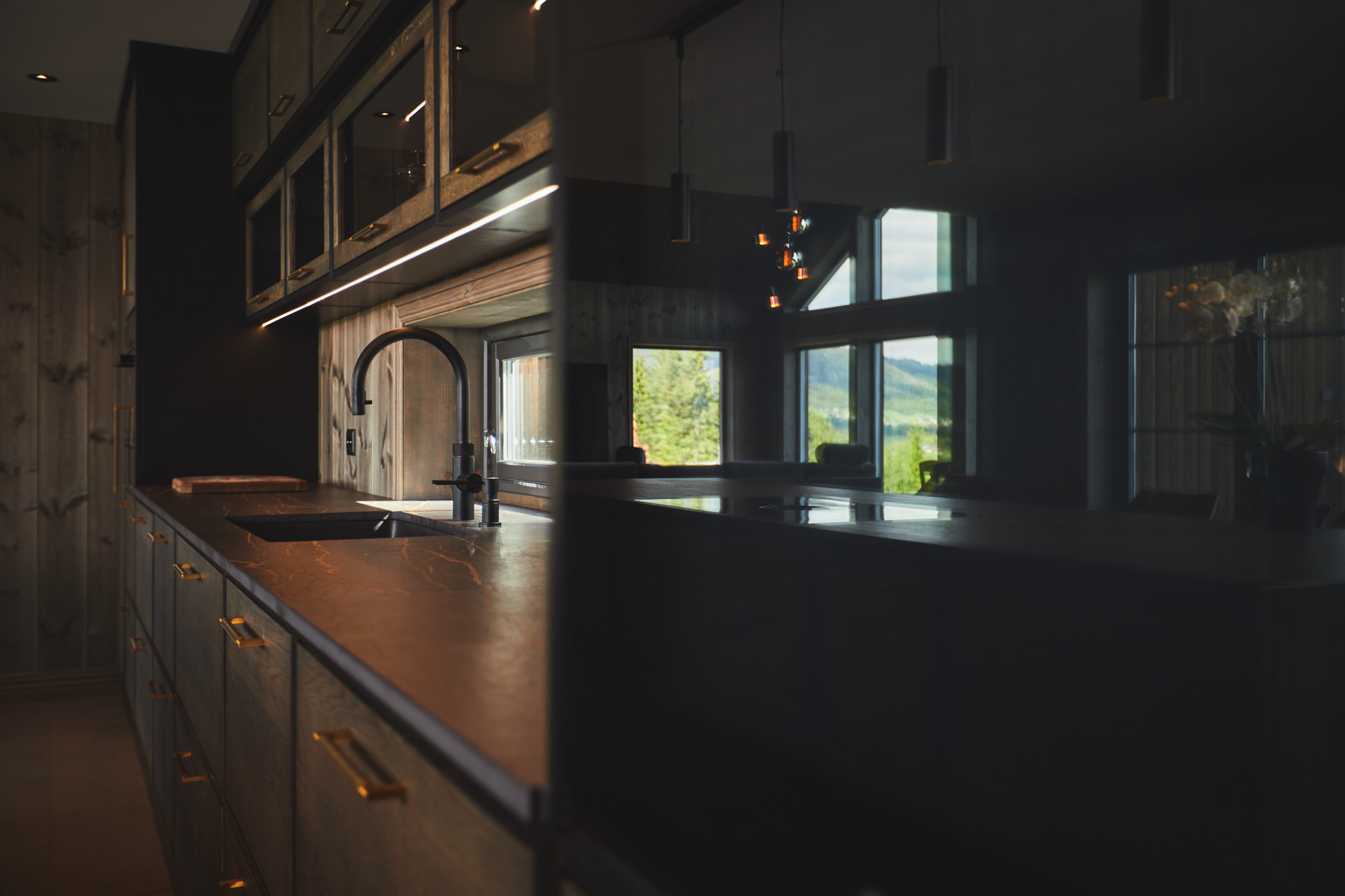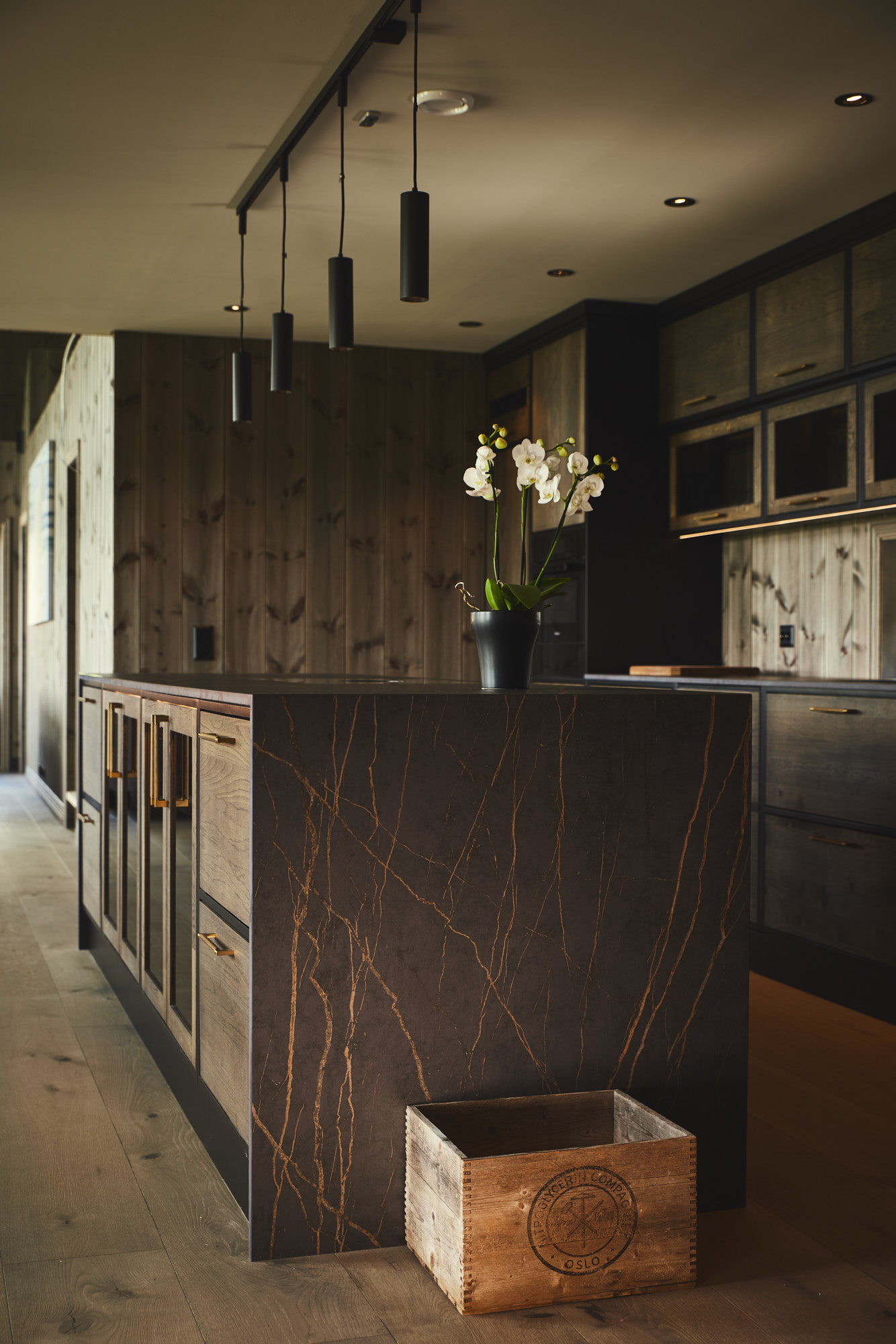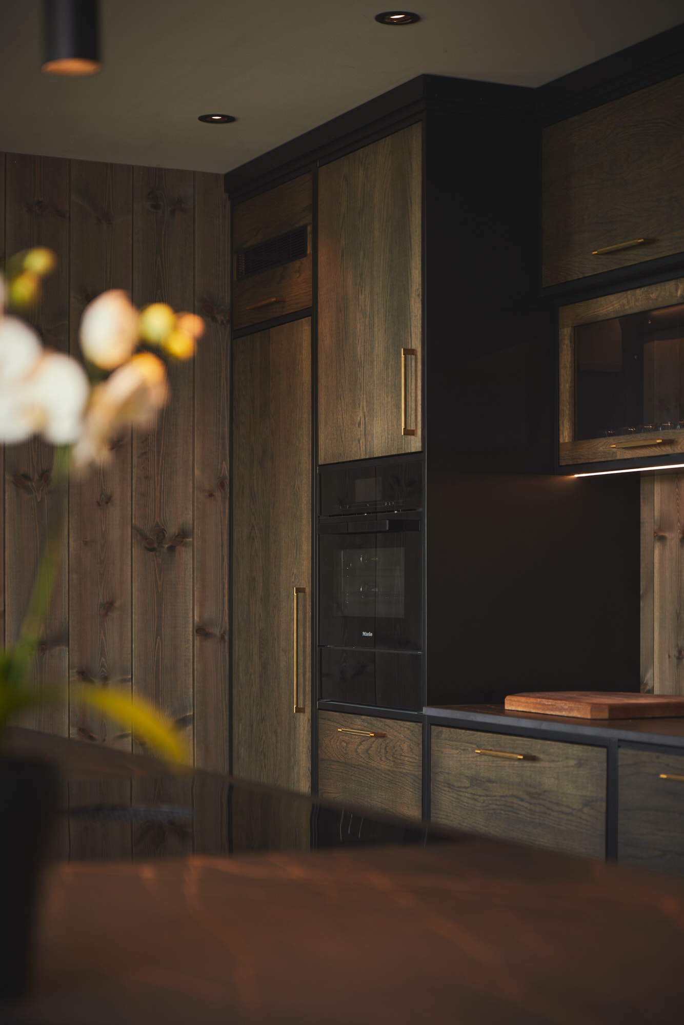 Dette er et stort, romslig og robust kjøkken i symmetrisk oppsett. Skrogene er bygget av kvistfri furu, malt i sort Musta. Kjøkkenfrontene er av 3-lags eik, behandlet med Osmo sort dekorvoks. Kjøkkeninnredning og veggpanel (fra Vyrk) er en perfekt match!