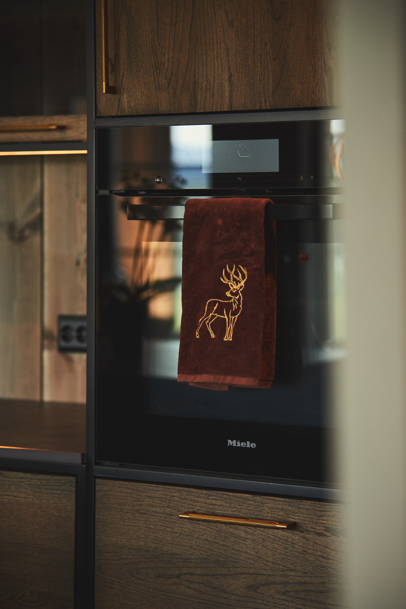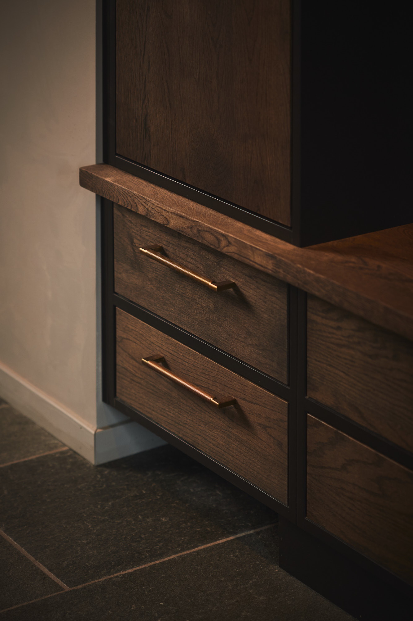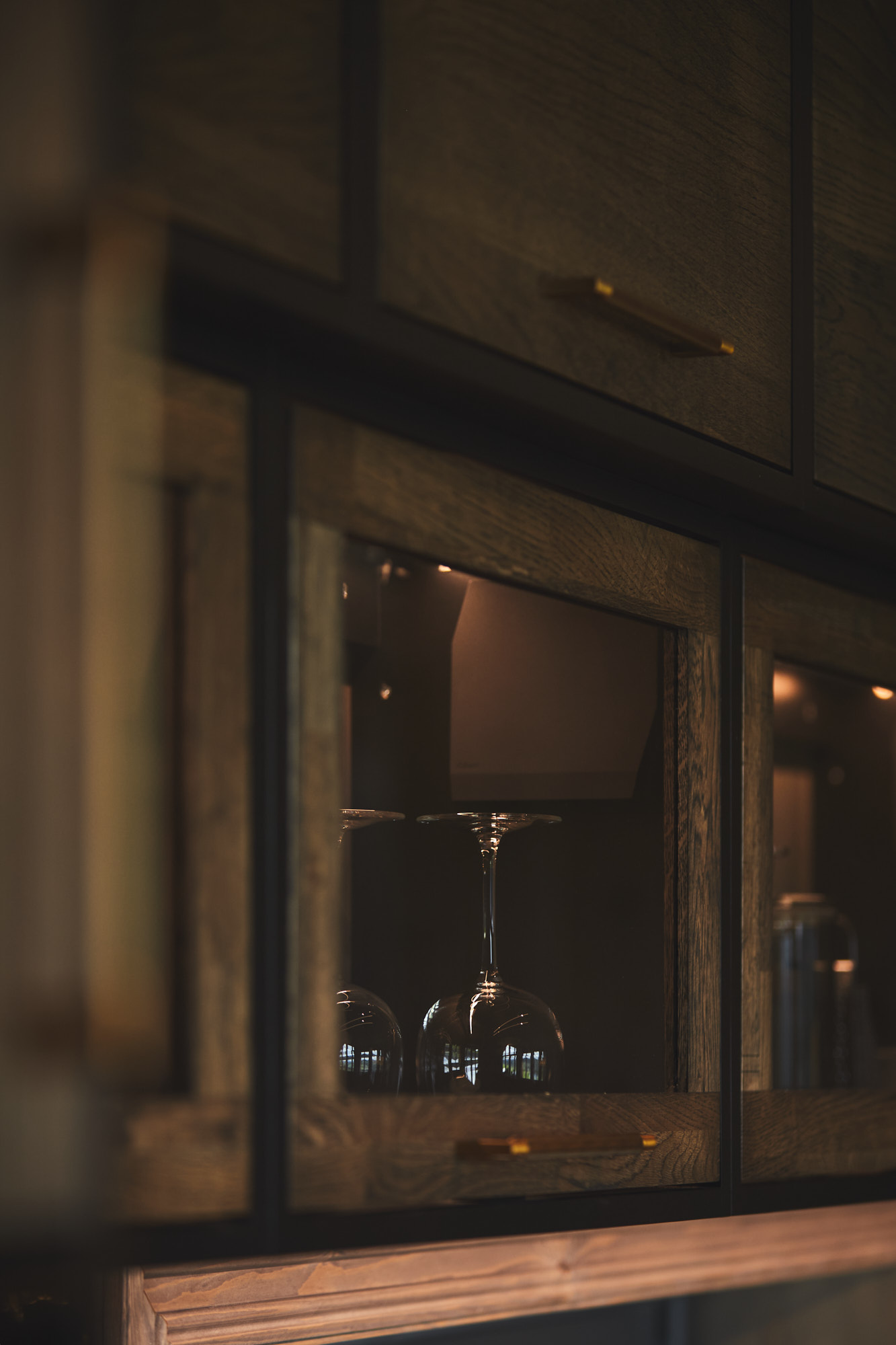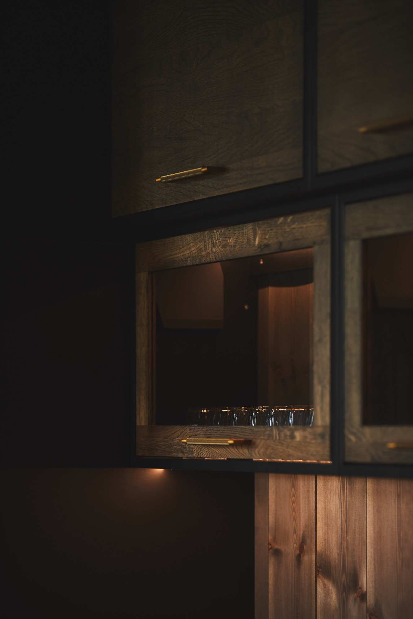Dette er et stort, romslig og robust kjøkken i symmetrisk oppsett. Skrogene er bygget av kvistfri furu, malt i sort Musta. Kjøkkenfrontene er av 3-lags eik, behandlet med Osmo sort dekorvoks. Kjøkkeninnredning og veggpanel (fra Vyrk) er en perfekt match!