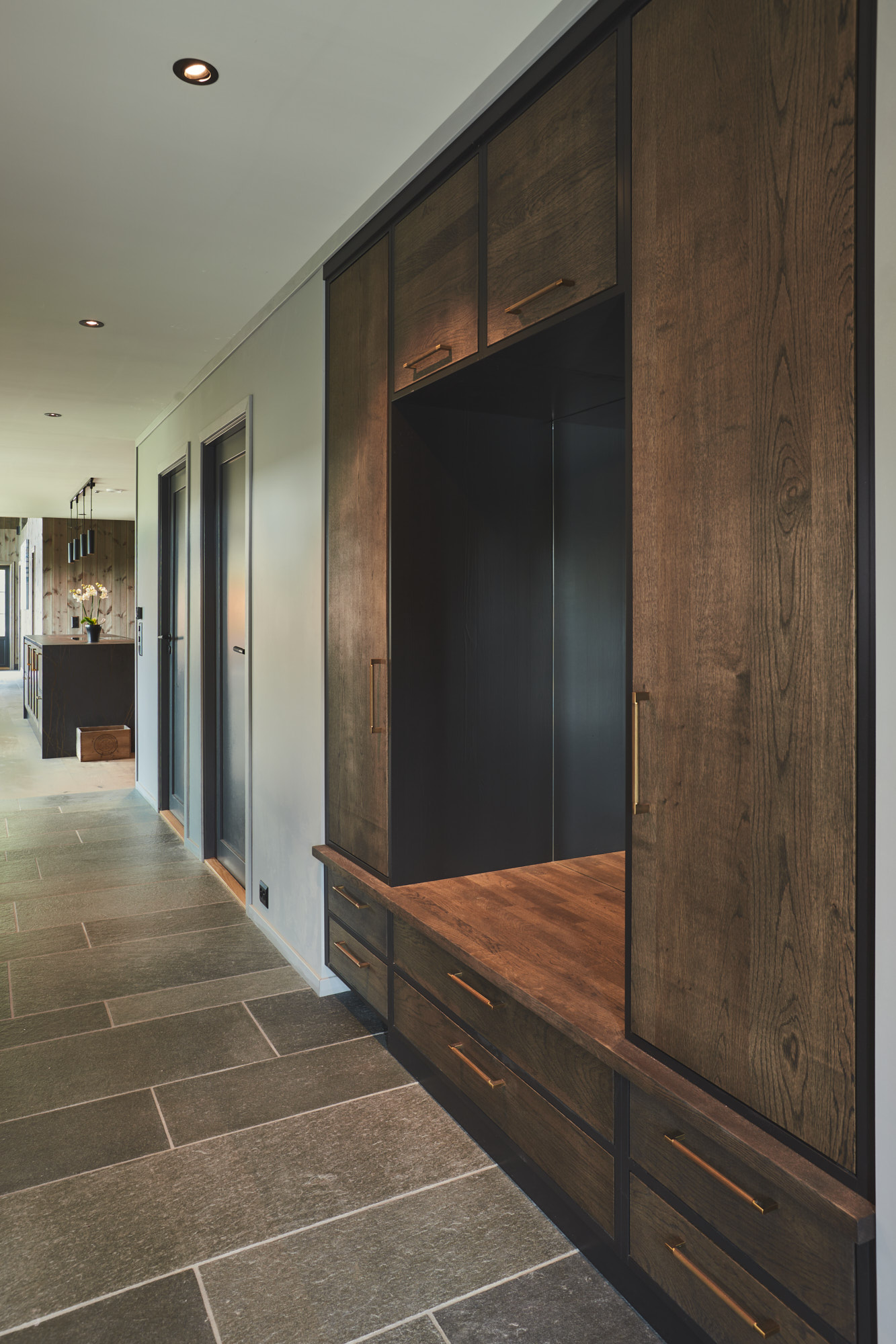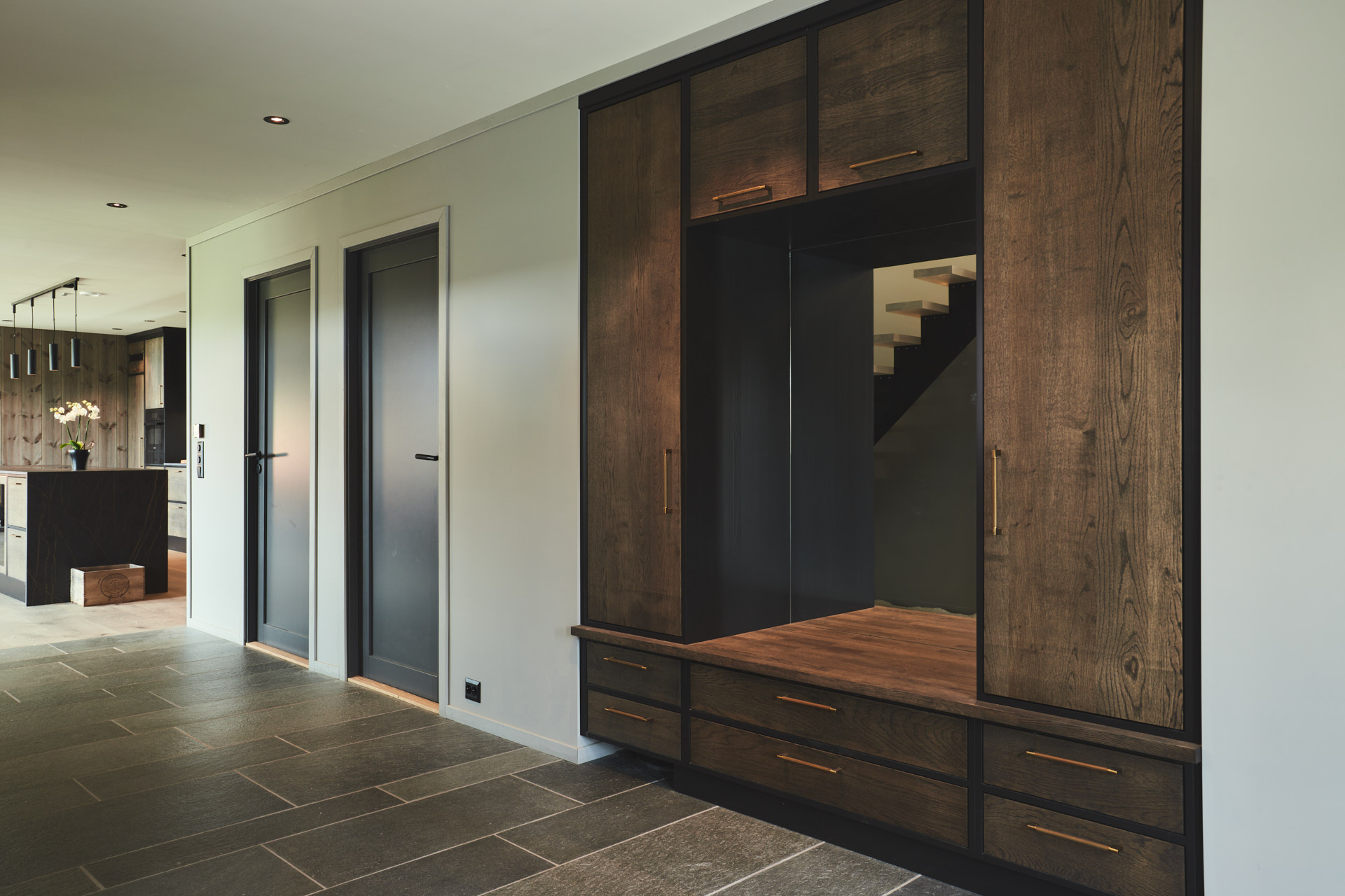 Garderobeløsningen i gangen har samme fronter og finish som kjøkkenet. Dette oppleves godt for øyet når man trer inn i huset, da man kan se garderoben og kjøkkenet samtidig i det man kommer inn. Garderobeskapet går i ett med veggen og består av skap, skuffer, benk og speil. Det er også utstyrt med en egen luke for robotstøvsugeren i sokkel.