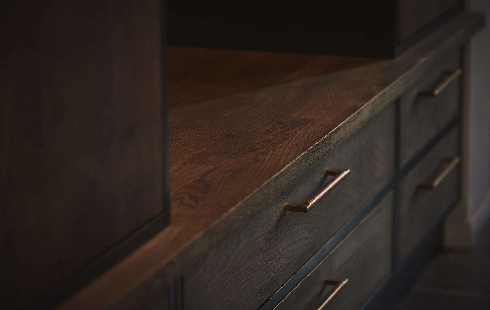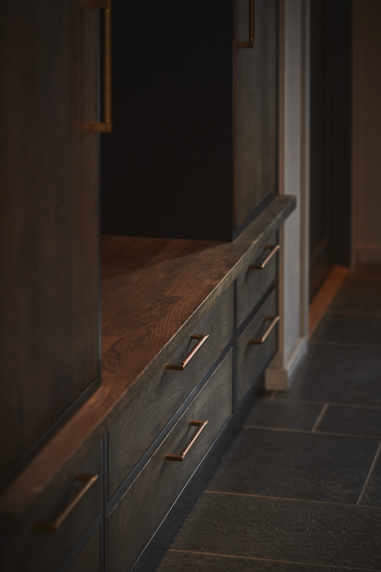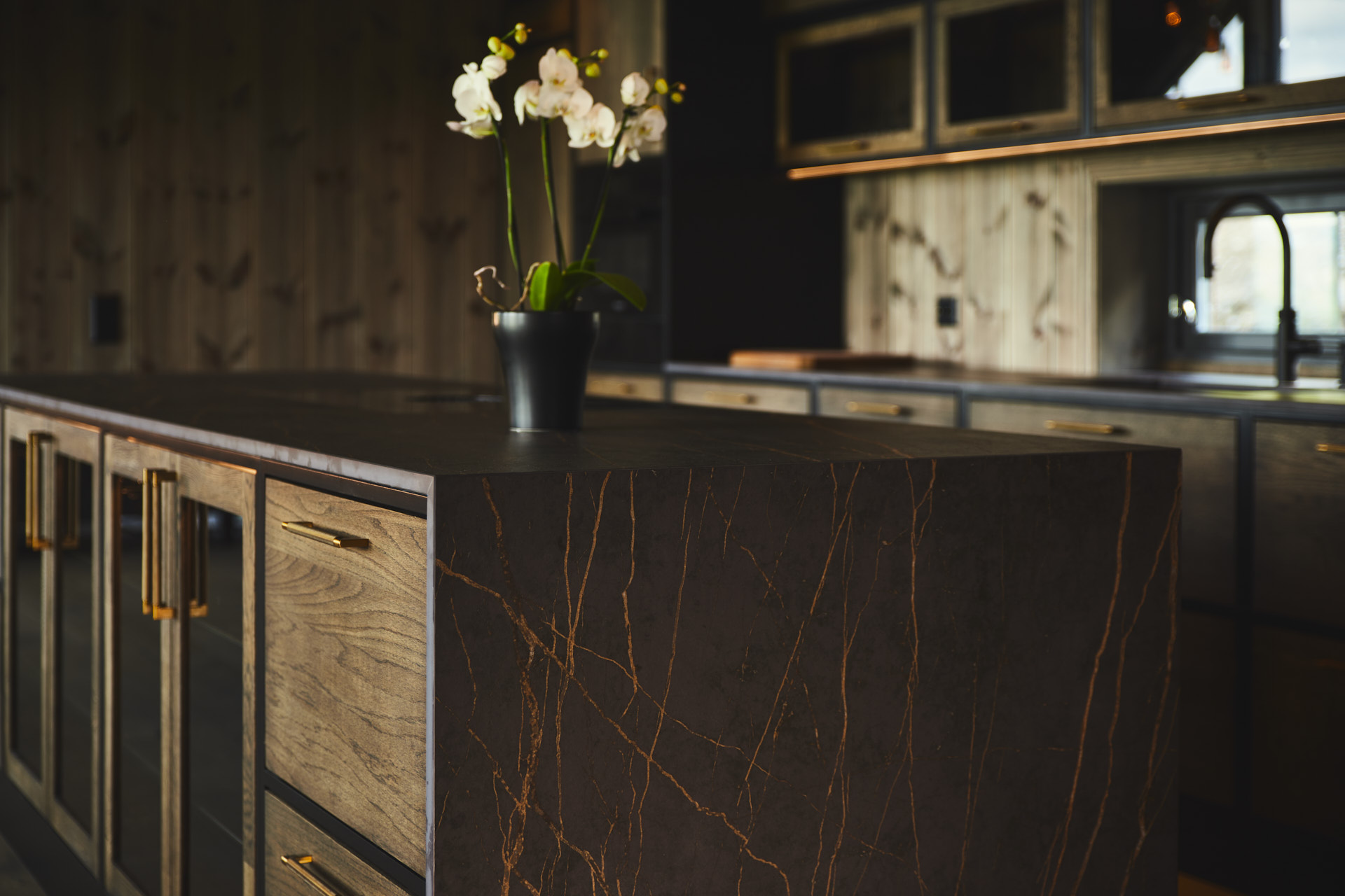 Denne er både lang og bred, med en masse oppbevaringsplass i form av skuffer og skap på begge sider. Et av skapene har uttrekkshylle for kjøkkenmaskin og de midterste skapene på utsiden har glassdører. Steinplate i 20 mm dekton med "waterfall" på sidene, med en BORA koketopp sentrert plassert.