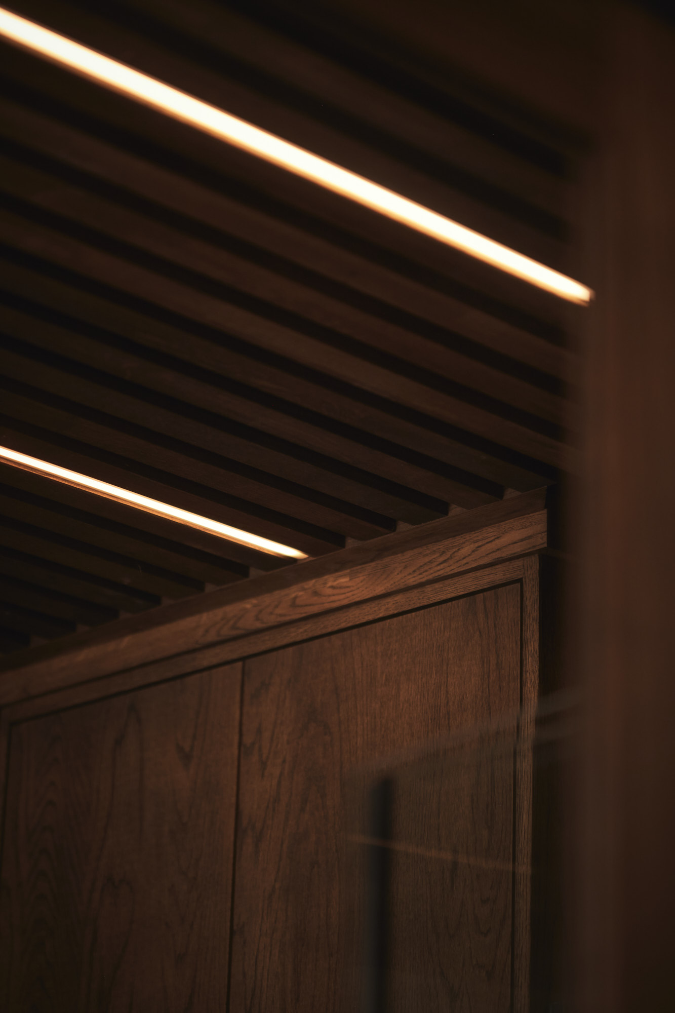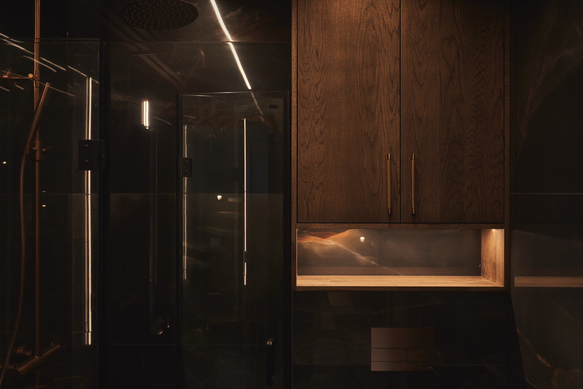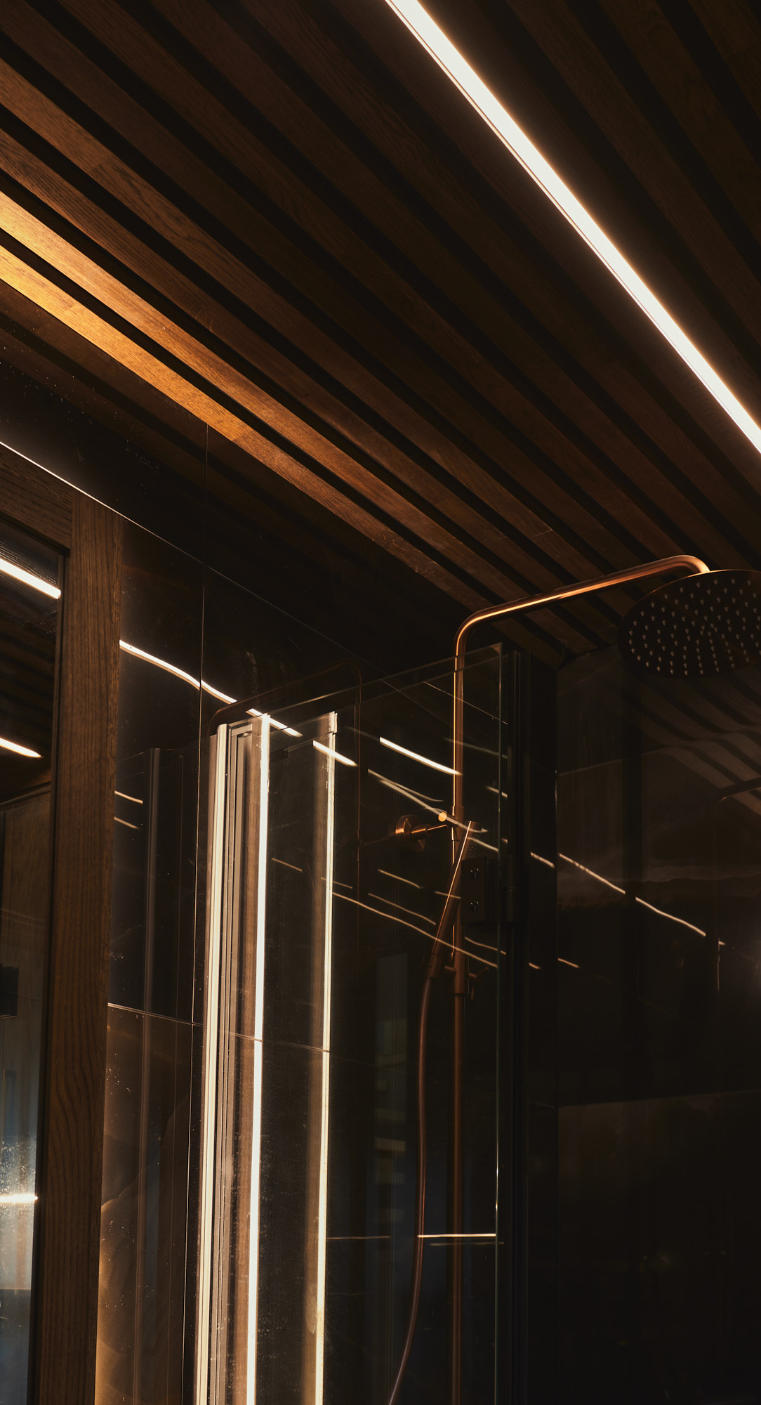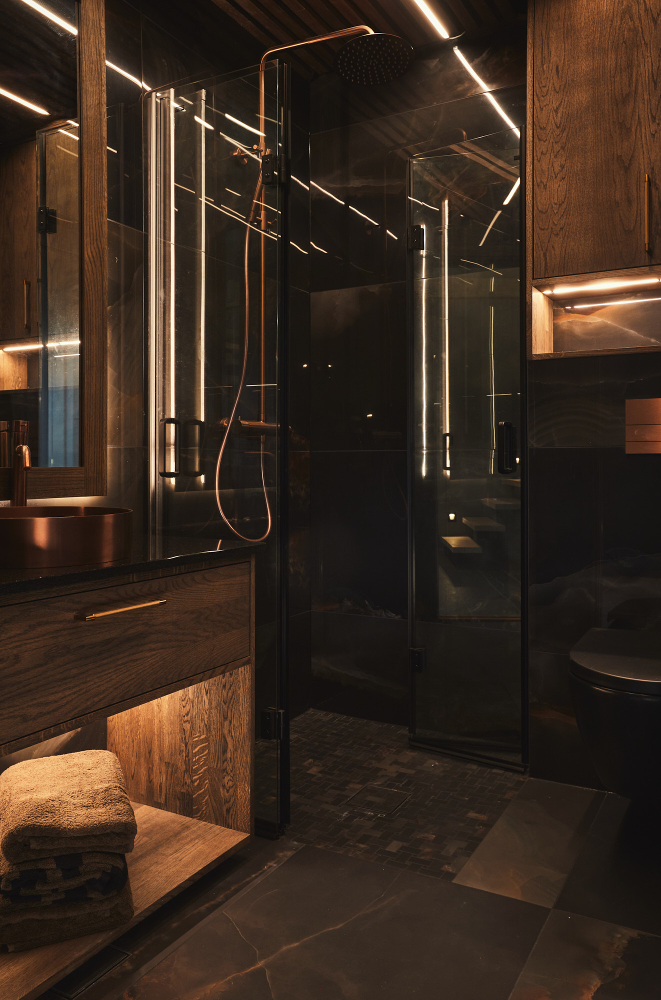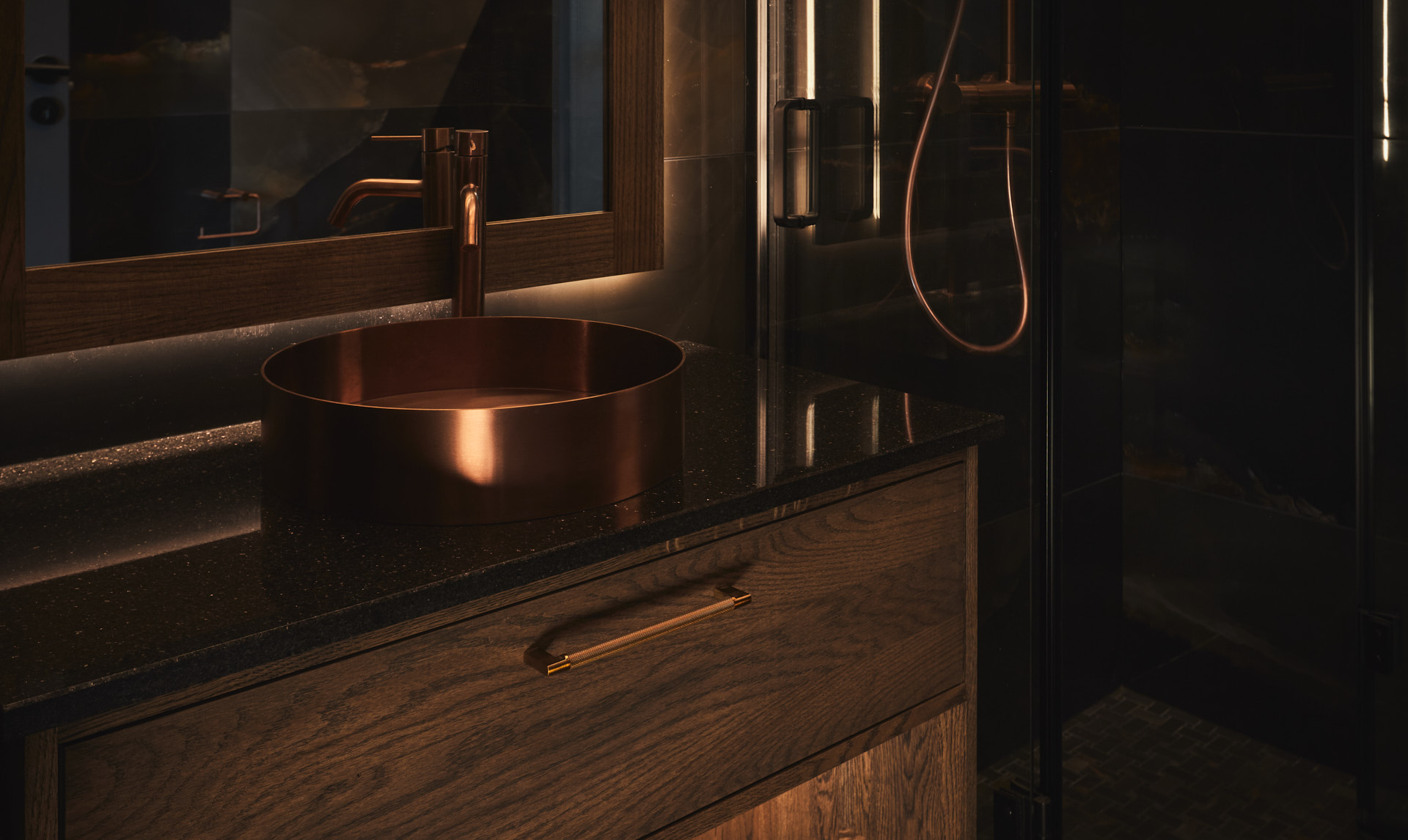 På badet er innredningen også av eik og består av servantskap med matchende speil og innfrest ledlys, innfelt skap med nisje og innfrest ledlys på vegg, samt spiler av eik i taket.